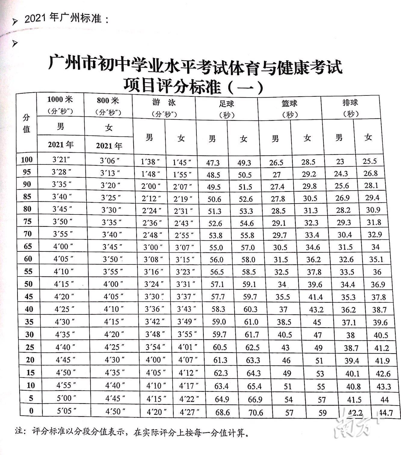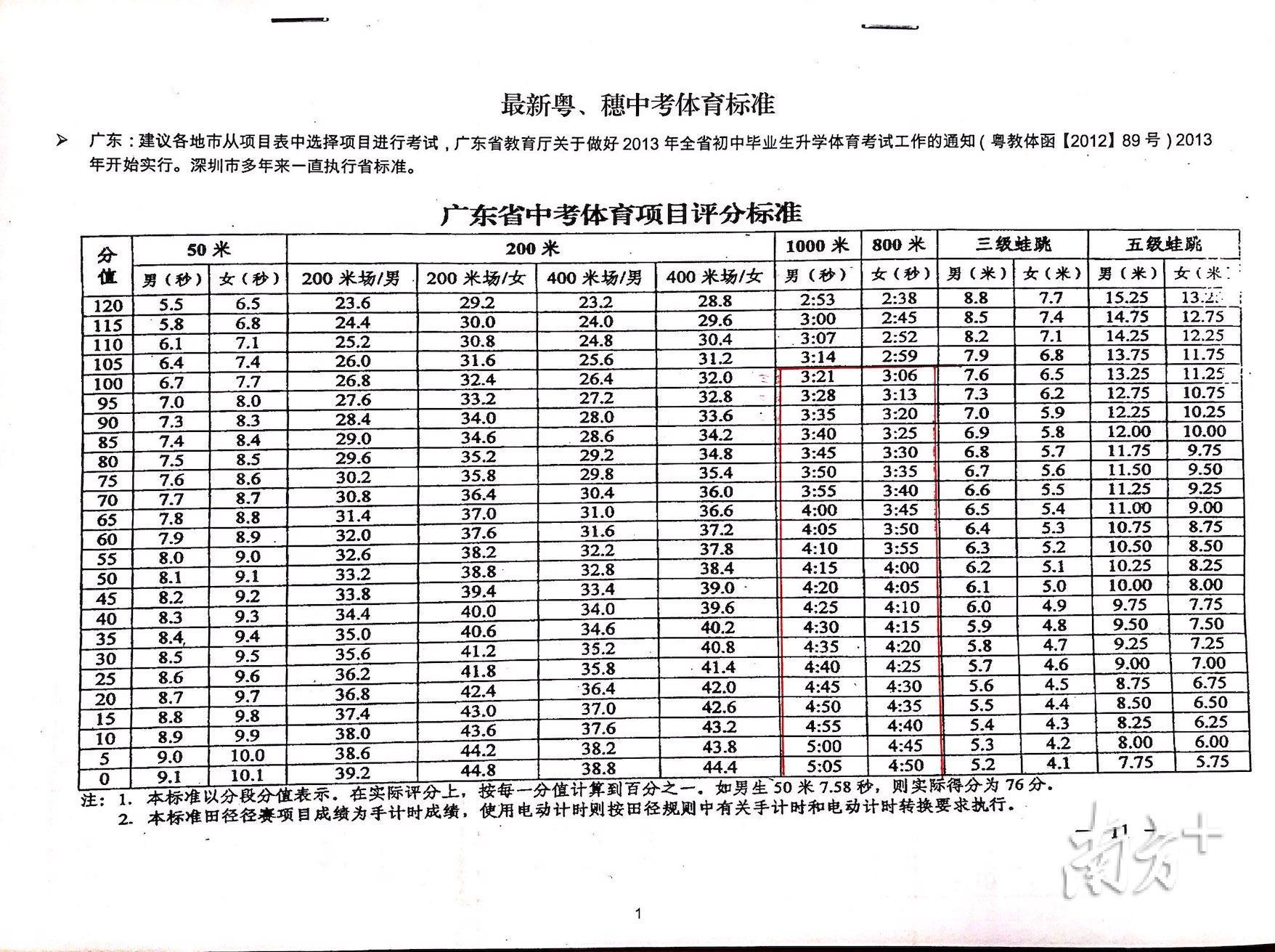“作为省会城市,理应全面对标中考体育标准,促进学生的体质、体能进一步发展提高。”广州市教育研究院体育教研员、省特级教师钟卫东说,按照广东省中考体育项目评分标准,男生1000米满分为3分21秒,女生1000米满分为3分6秒,2015年深圳已经全面对标省标。