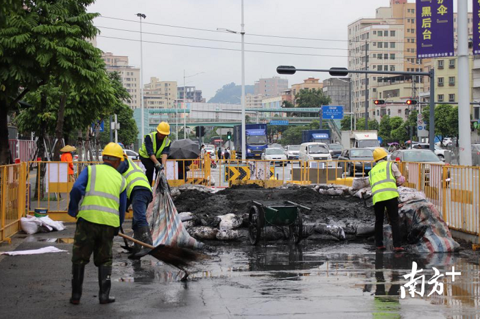 项目部迅速反应,着力解决渗水、积水问题,在各工点配备上百台水泵进行全天候抽排。光明区水务局更是主动出击、多方奔走,帮助协调两台防洪泵车加快抽水进度,同时安排专人驻守现场,协助解决制约施工问题。水位稍降、条件好转,即立刻组织人员和设备见缝插针式的抢工,赶时间。