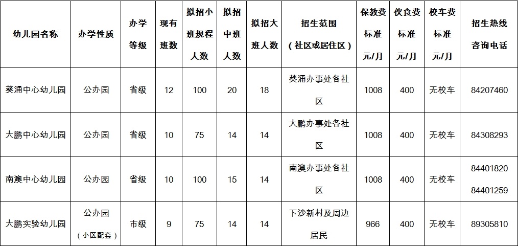 1.网上预报名。登录大鹏新区政府在线,点击“政务服务”-“教育”-“幼儿园报名”,选择入读的幼儿园进行报名。民办幼儿园报名时间:6月13日10:00—7月10日24:00;