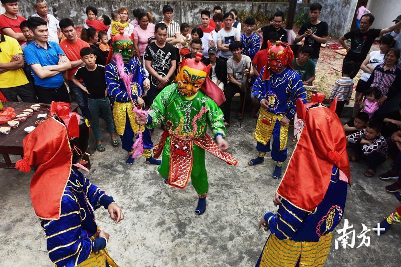 简朴威武、原始粗犷、豪放有力……3月3日,在雷州市松竹镇东阁村,一名名“特殊演员”戴着面具,在喧闹的锣鼓声和鞭炮的轰响下,挥膀舞臂展拳脚,到家家户户翩翩起舞……这是该村一年一度举行的傩舞民俗活动表演。