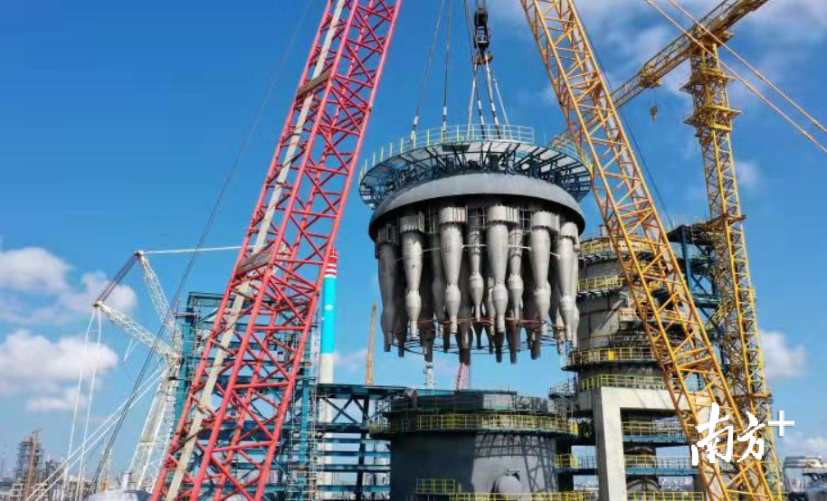 “两器”(沉降器、再生器)总重2811吨,其中,再生器高47米,最大直径15.8米,重1817吨,加基础安装后总标高53.65米。由于体积超大运输困难,2018年12月26日,按照施工组织设计,“两器”在现场分4段进行制作组对和内件的模块化安装,5月19日,再生器第一段筒体吊装就位。