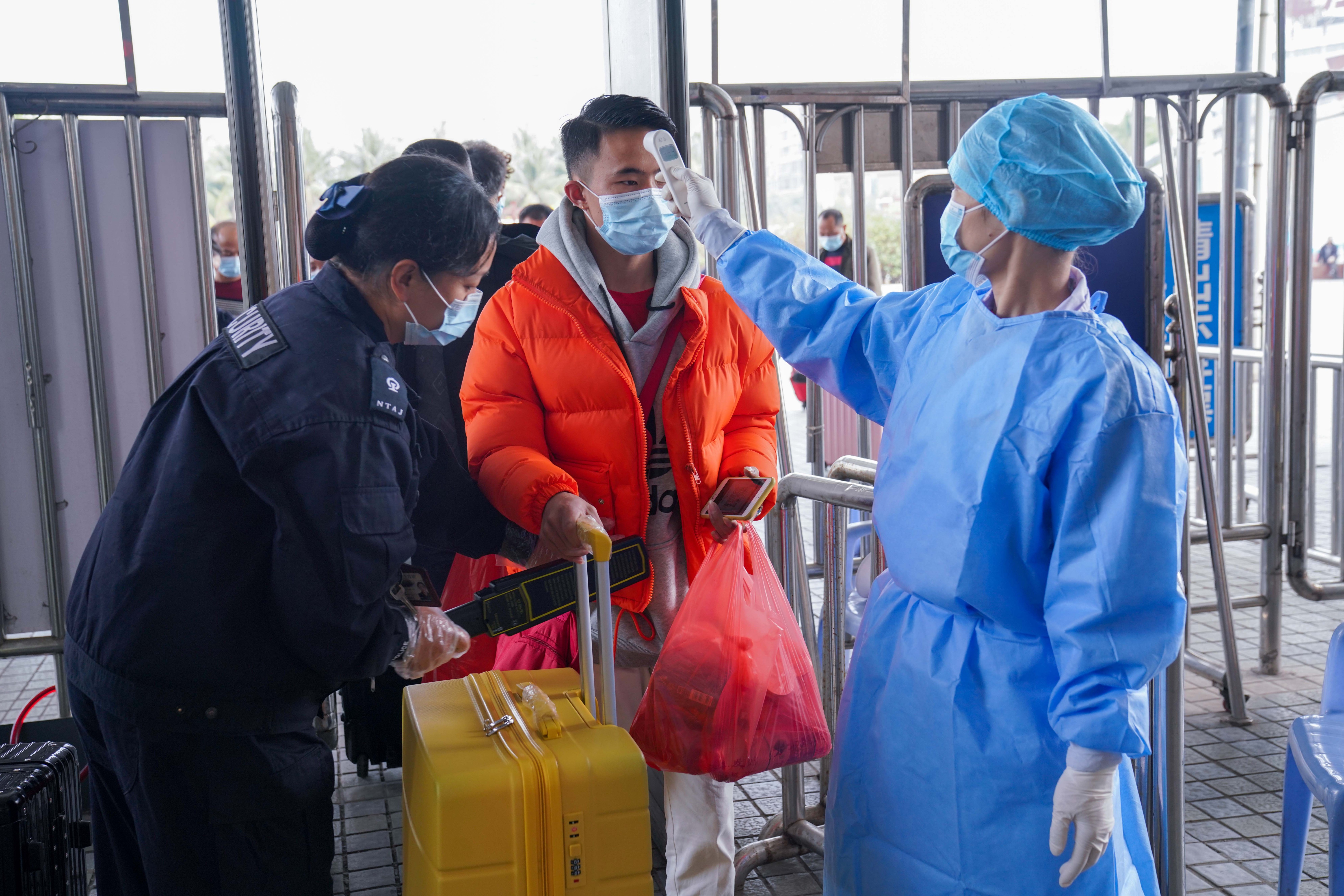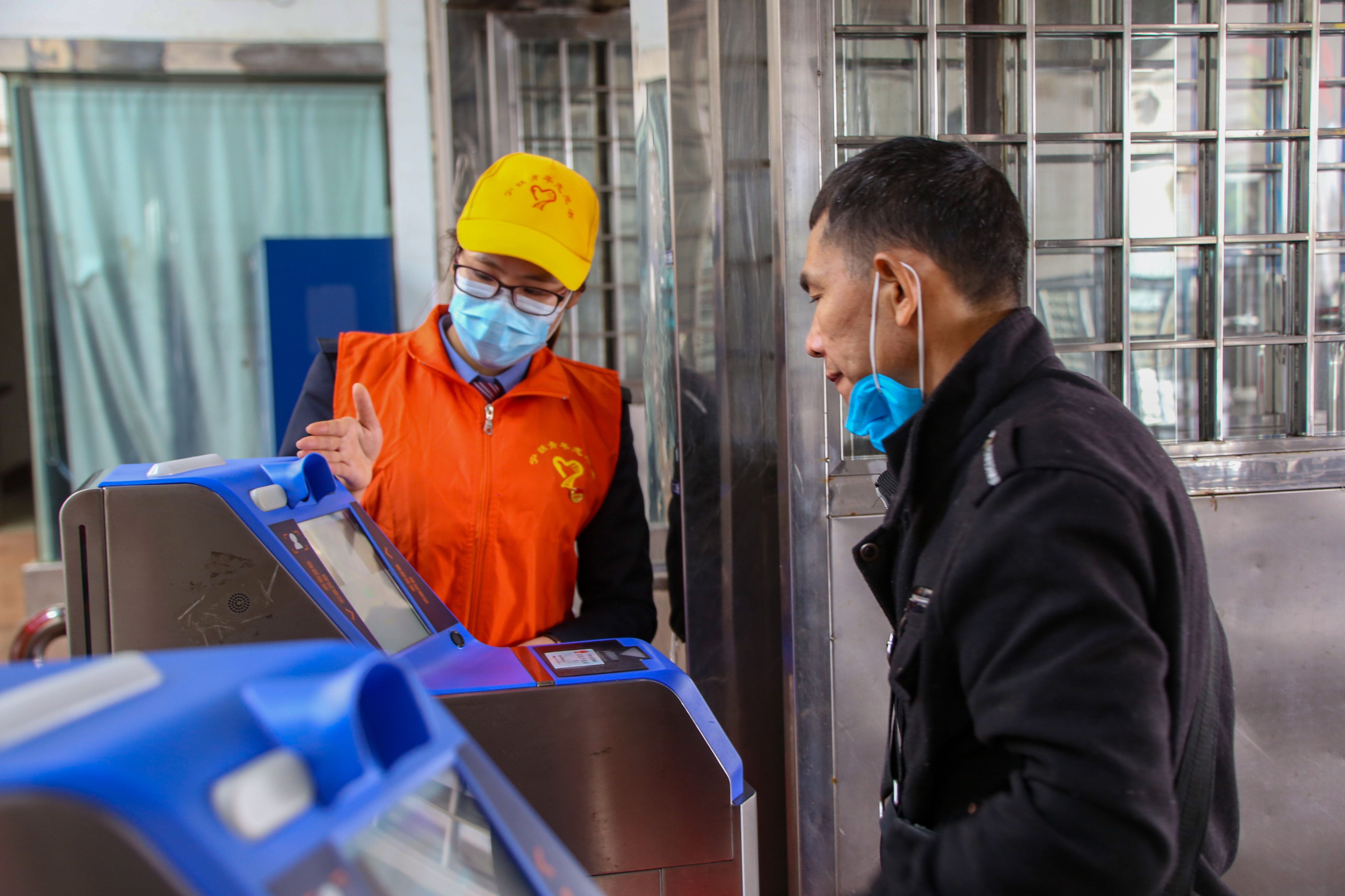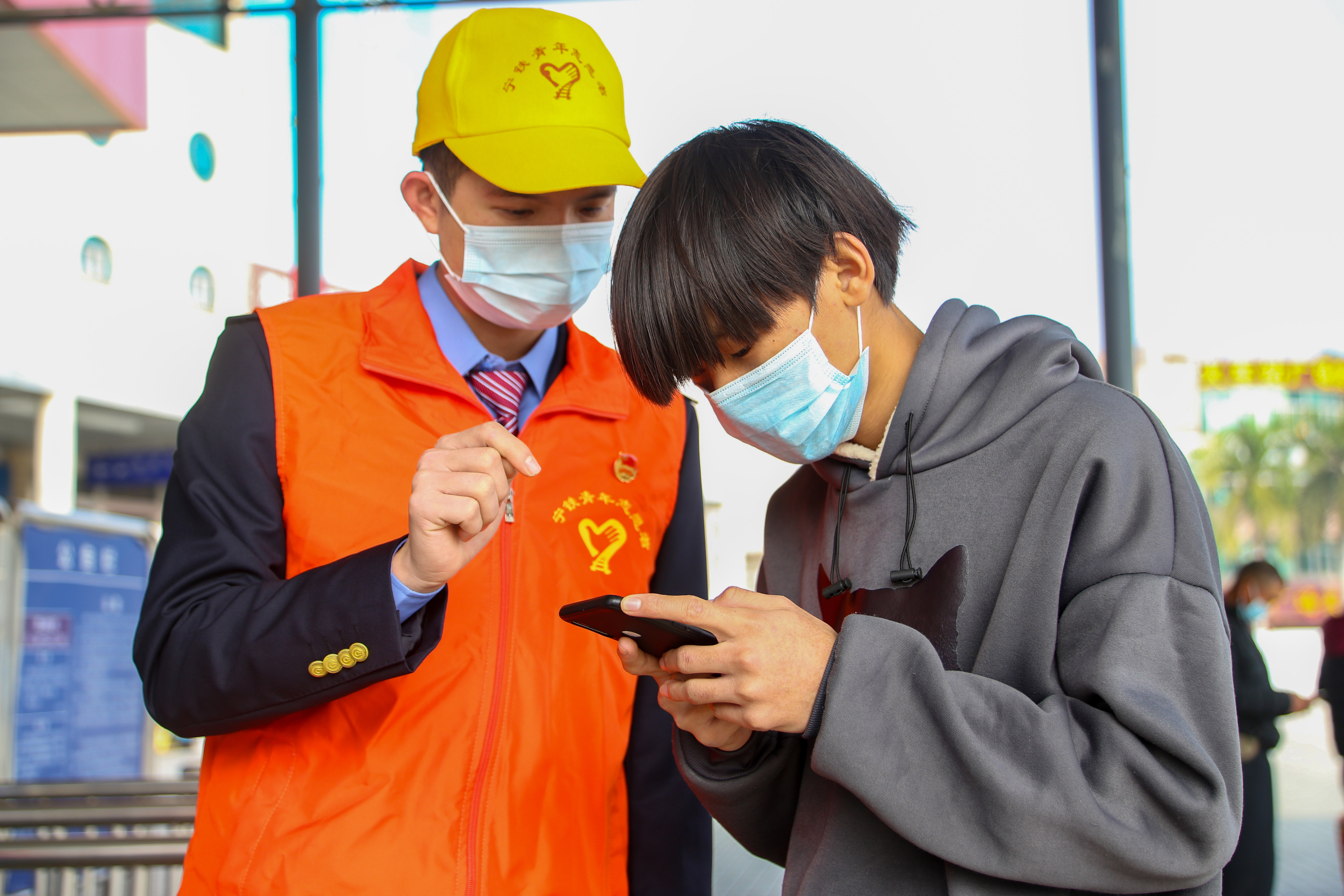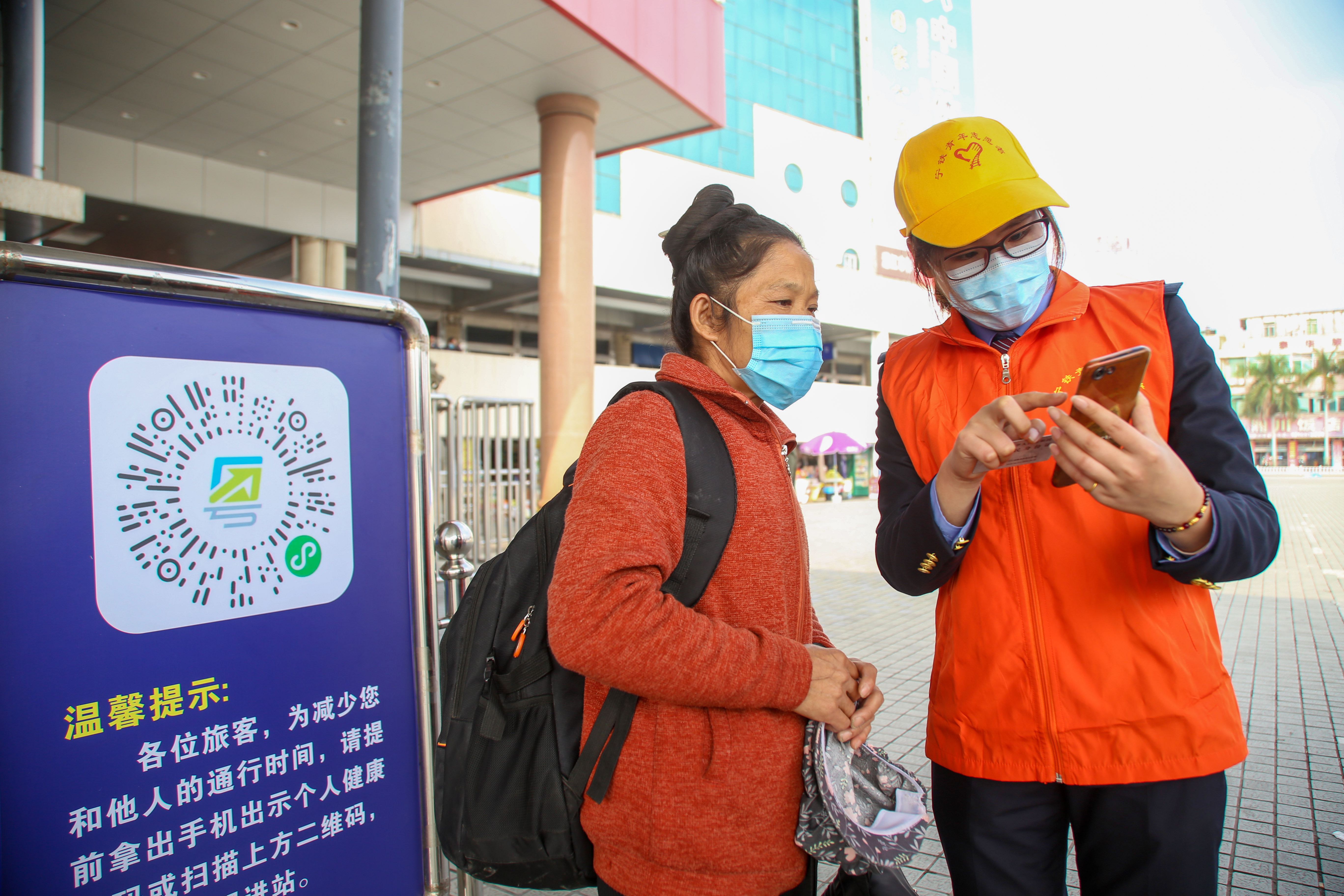 湛江火车站青年志愿者指导旅客扫健康码有序进站。