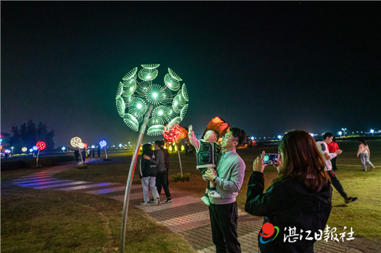 霞山观海长廊大草坪上的蒲公英造型灯吸引孩子。