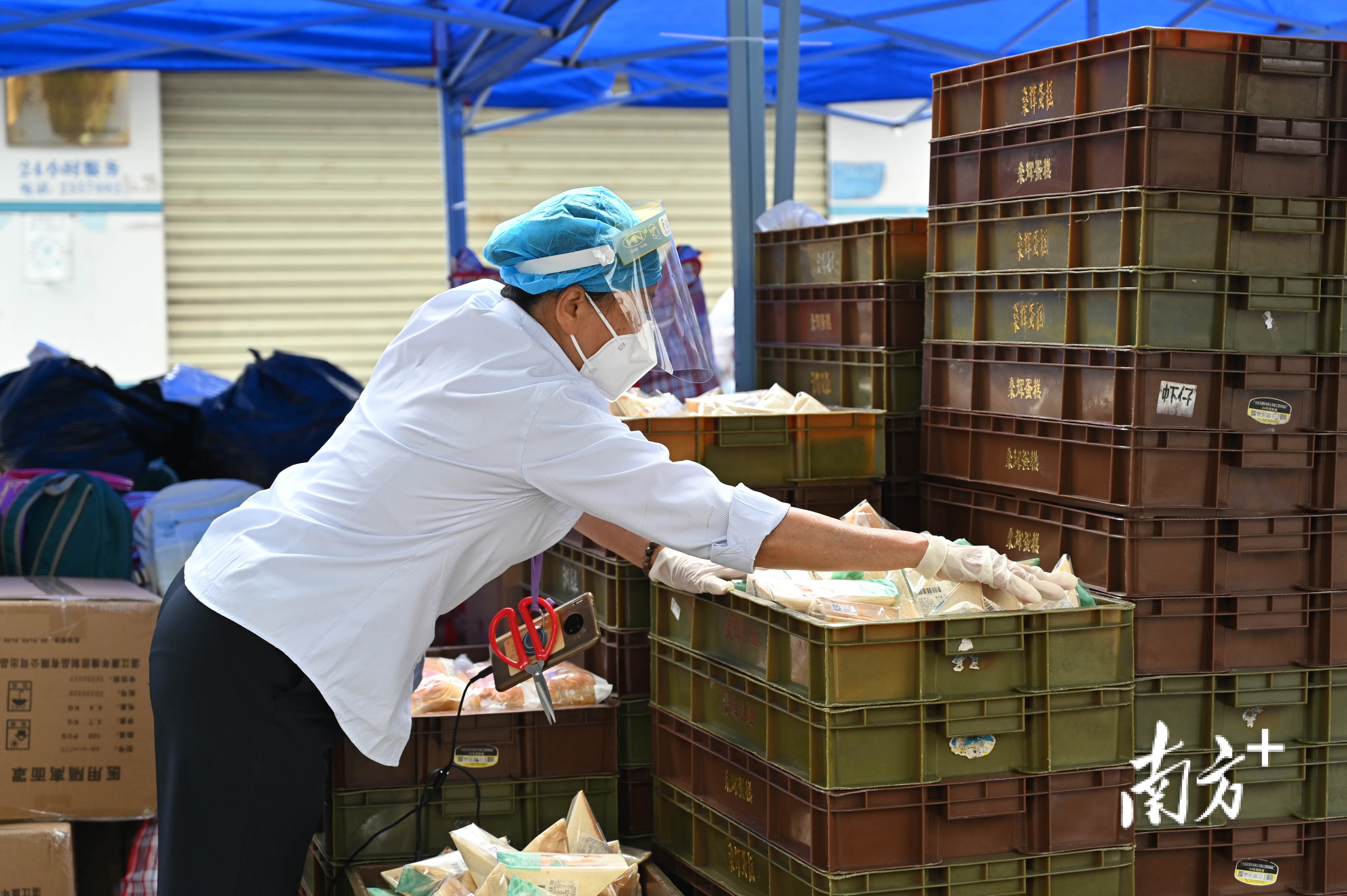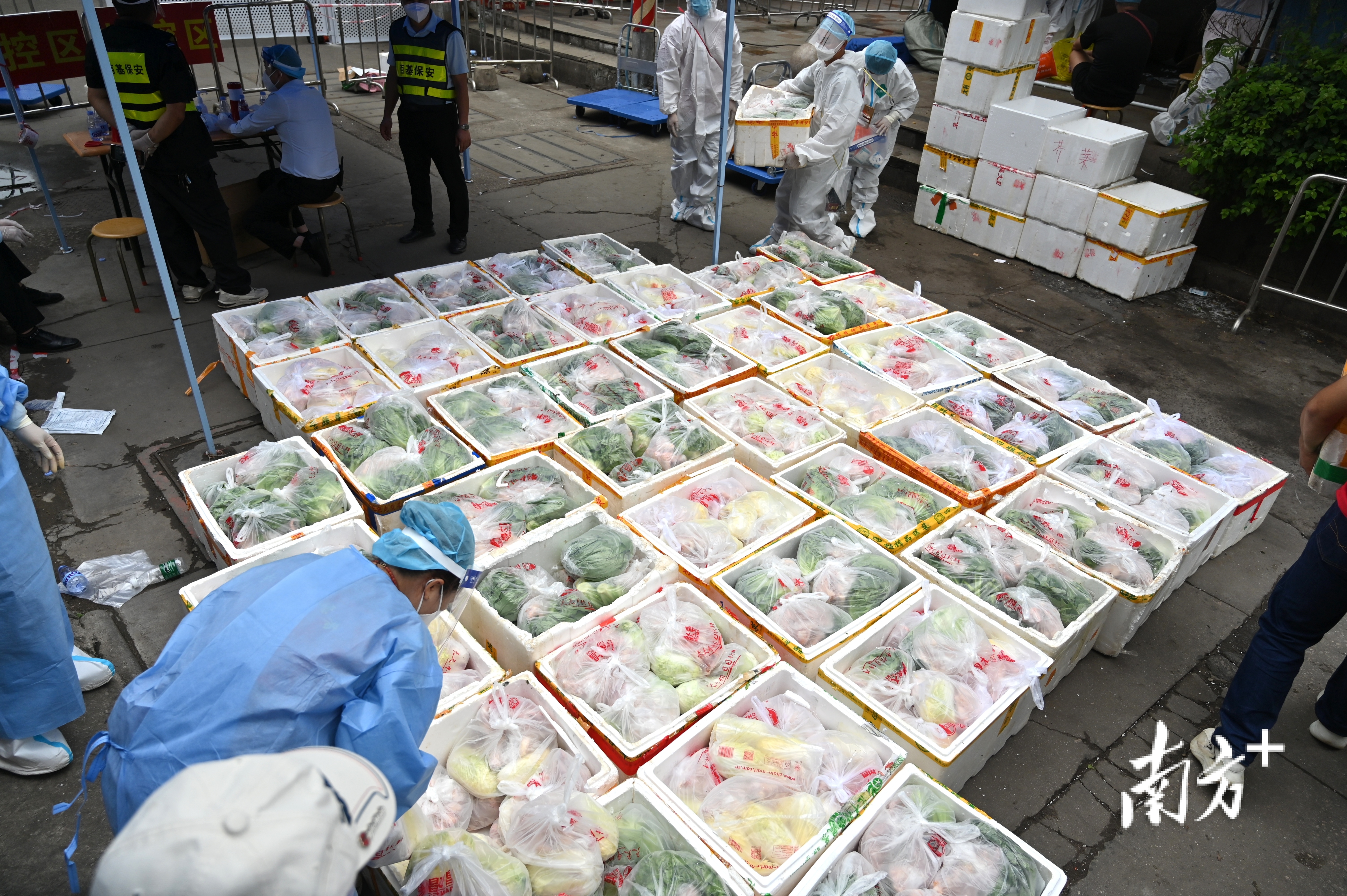 首批生活物资是5月9日早9时分发的早餐,居民每人一瓶牛奶一个面包。当天下午至夜晚,鸡肉、鸡蛋、蔬菜和米面油盐等物资都将陆续运抵封控区。5月10日中午饭点前,一排排的物资运输车又驶向封控区前门,志愿者放下手中的盒饭,通过接力的方式,把一箱箱沉甸甸的食品传递到封控区门口摆放清点。“我们要确保封控区群众的三餐有保障,吃得饱吃得放心。”友谊街道办的负责人表示,不仅要保证物资量足,更要及时送到每家每户手中。