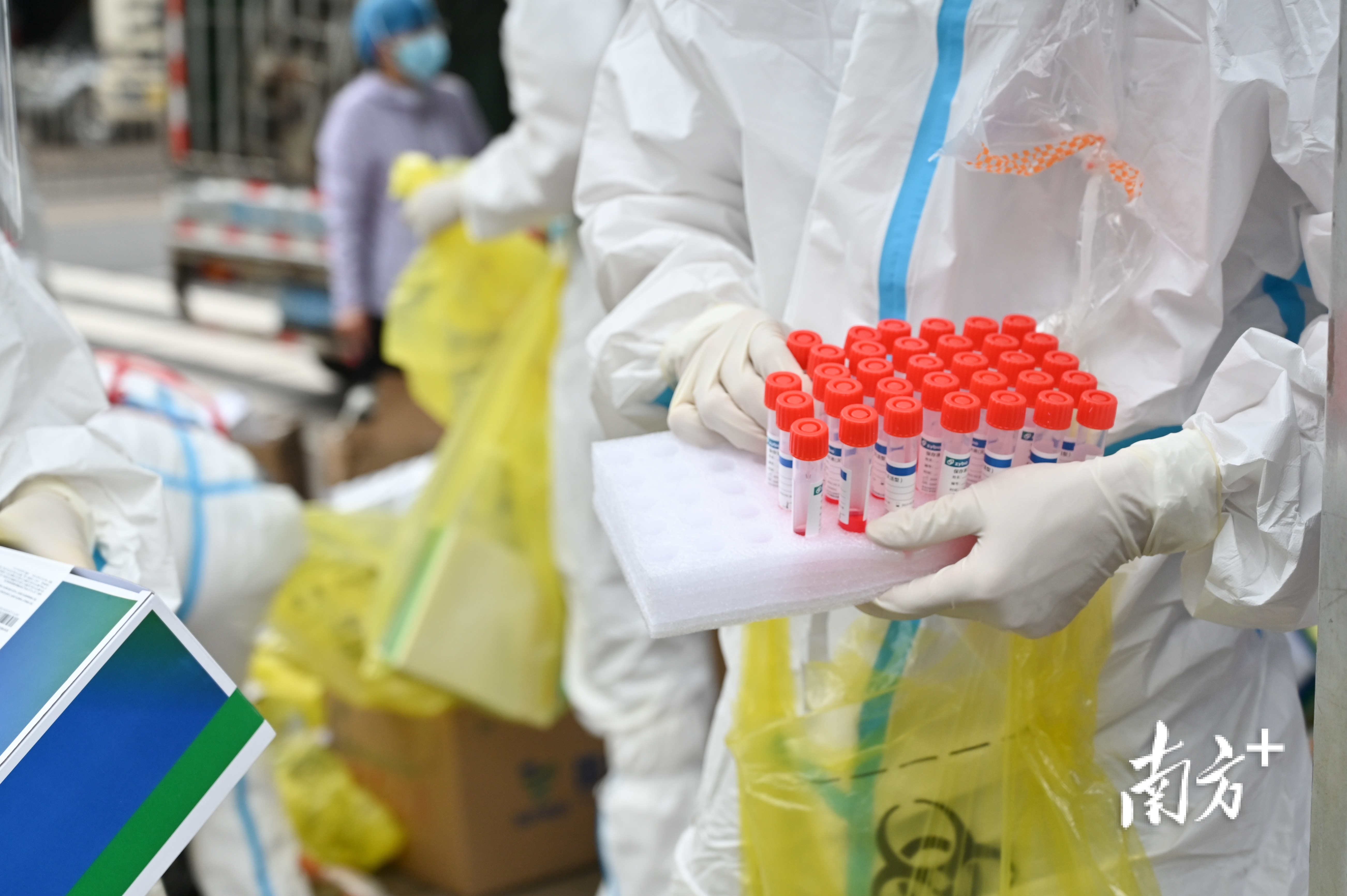 9日早上,记者来到封控区外围,30多名来自广东医科大学附属第二医院的医护人员身穿防护服,腰系采样物资,整装待发,即将进入封控区内,为居民进行第一次上门核酸采样。
