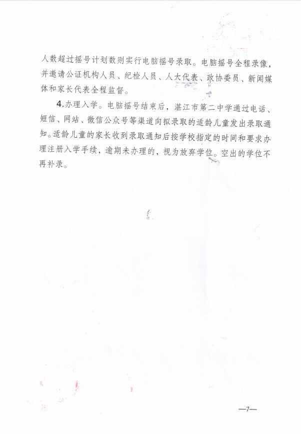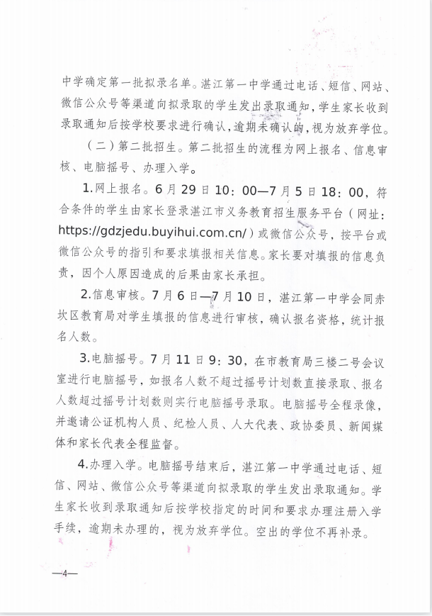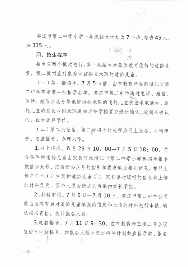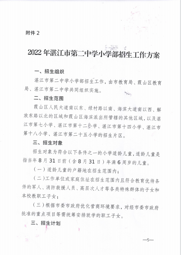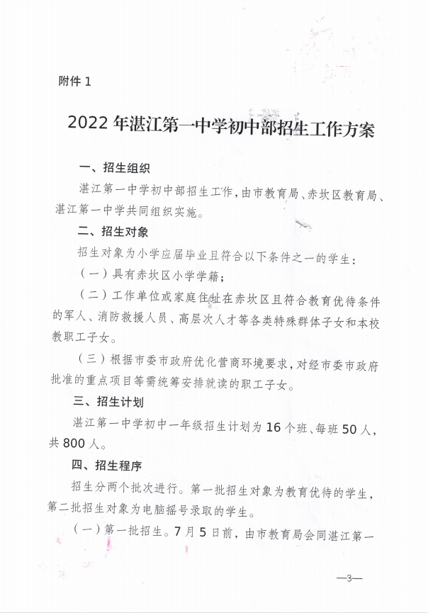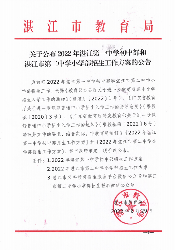 6月29日,湛江市教育局公布2022年湛江第一中学初中部和湛江市第二中学小学部招生工作方案,明确湛江第一中学初中一年级招生计划为16个班、每班50人,共800人;湛江市第二中学小学一年级招生计划为7个班、每班45人,共315人。两所学校招生分两个批次进行,网上报名时间均为6月29日10:00—7月5日18:00。