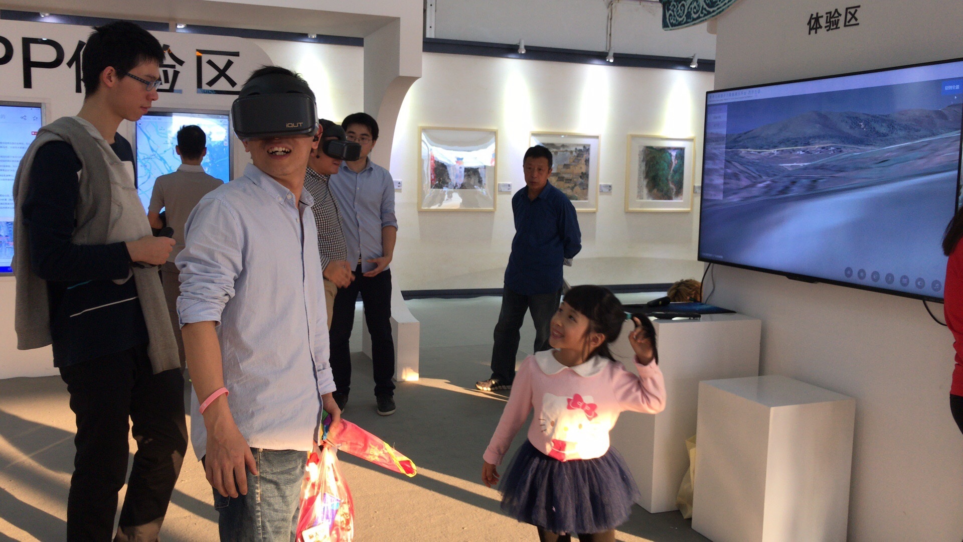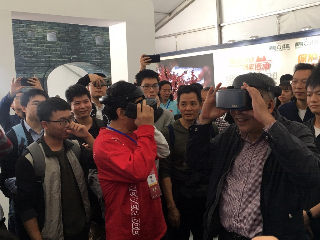 南粤古驿道VR体验区人头攒动,参观者们纷纷争先拿起VR眼镜戴上,迫不及待地体验置身南粤古驿道的真实场景。