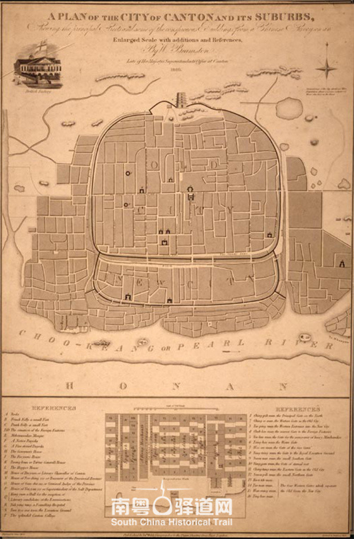 布兰斯通(Bramston)绘制的1840年的广州历史地图,名称为“广州城和城郊地图”,反映城外已经形成了贸易的场所。在地图的左上角小图是英国商馆的景观图,地图的下方是十三行地区的布置平面图,并列出名称。广州城又分旧城和新城,在最北面城墙顶端用写实的表现方式绘制了有五层楼高的镇海楼。
