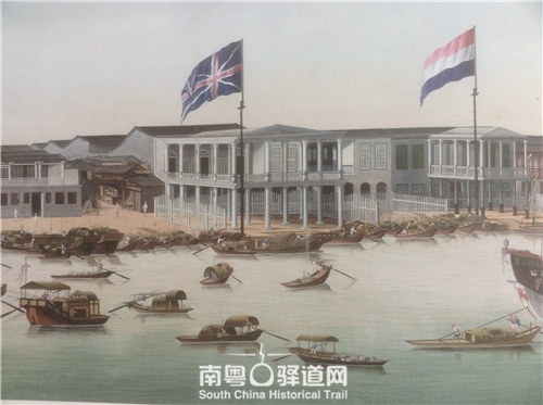 图为18世纪外销画中“十三行”夷馆的英国商馆和荷兰商馆飘扬着英国和荷兰的旗帜。