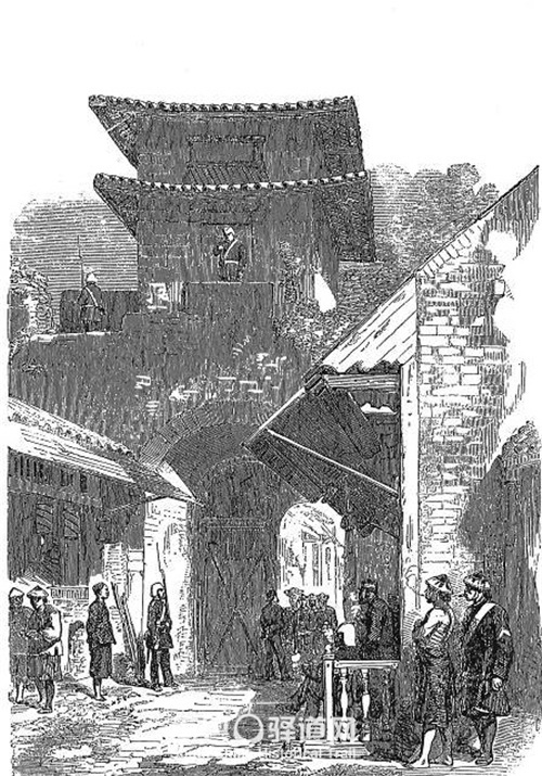 图为19世纪70年代的广州西门,引自《维多利亚时代中国的图像》。