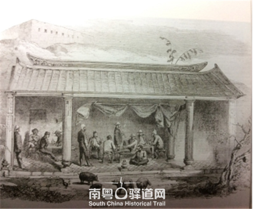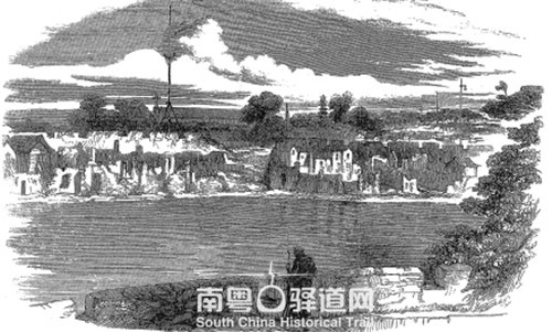 图为1858年,广州东门在第二次鸦片战争中,成为入侵法国军队的司令部,引自英国《伦敦新闻画报》。