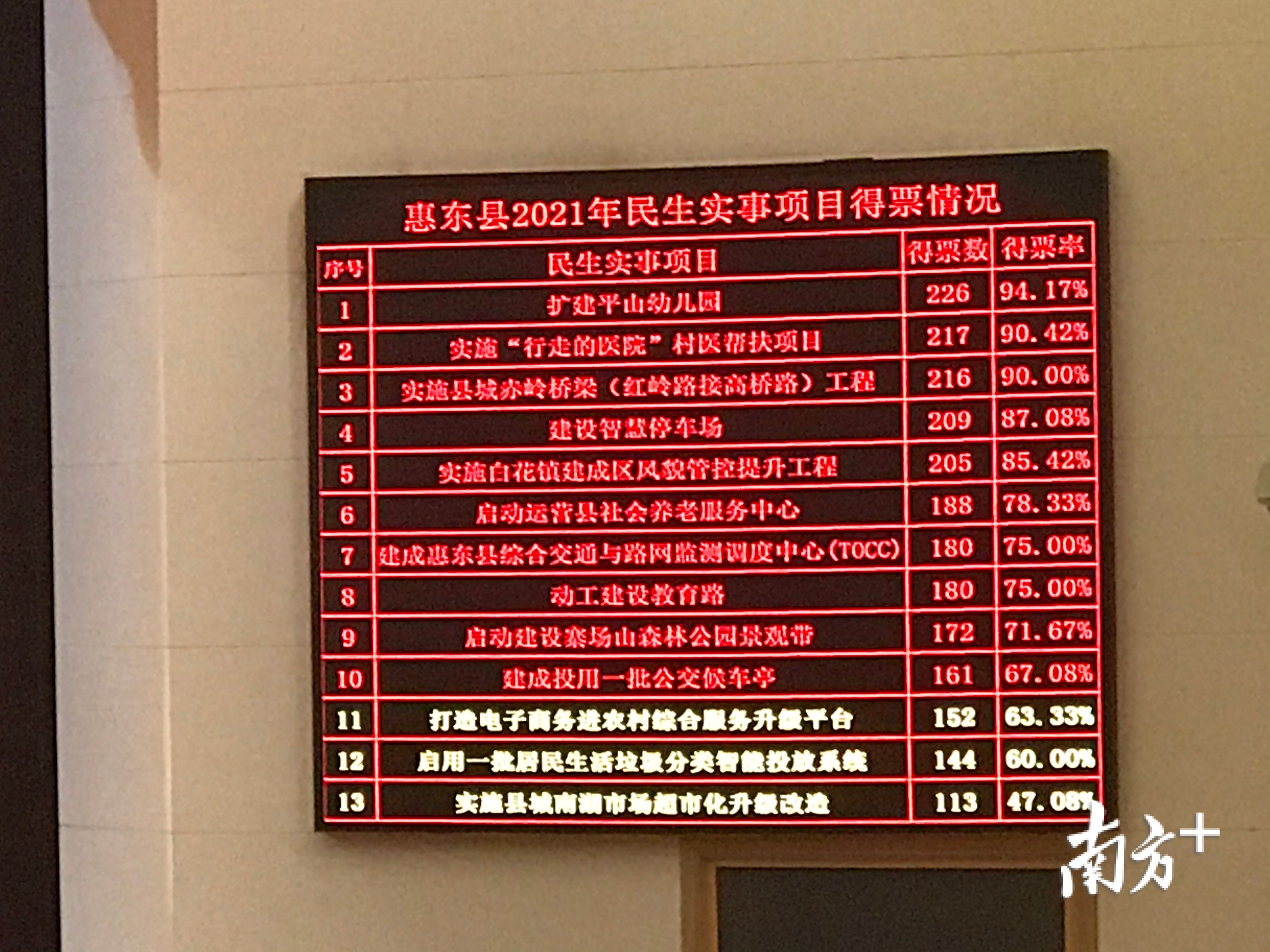 经大会现场票决,扩建平山幼儿园、实施“行走的医院”村医帮扶项目、实施县城赤岭桥梁(红岭路接高桥路)工程、建设智慧停车场、实施白花镇建成区风貌管控提升工程、启动运营县社会养老服务中心、建成惠东县综合交通与路网监测调度中心(TOCC)、动工建设教育路、启动建设寨场山森林公园景观带、建成投用一批公交候车亭,以上10件民生实事项目正式确定为惠东县2021年十件民生实事,交由县政府组织实施,并接受人大代表和人民群众监督。