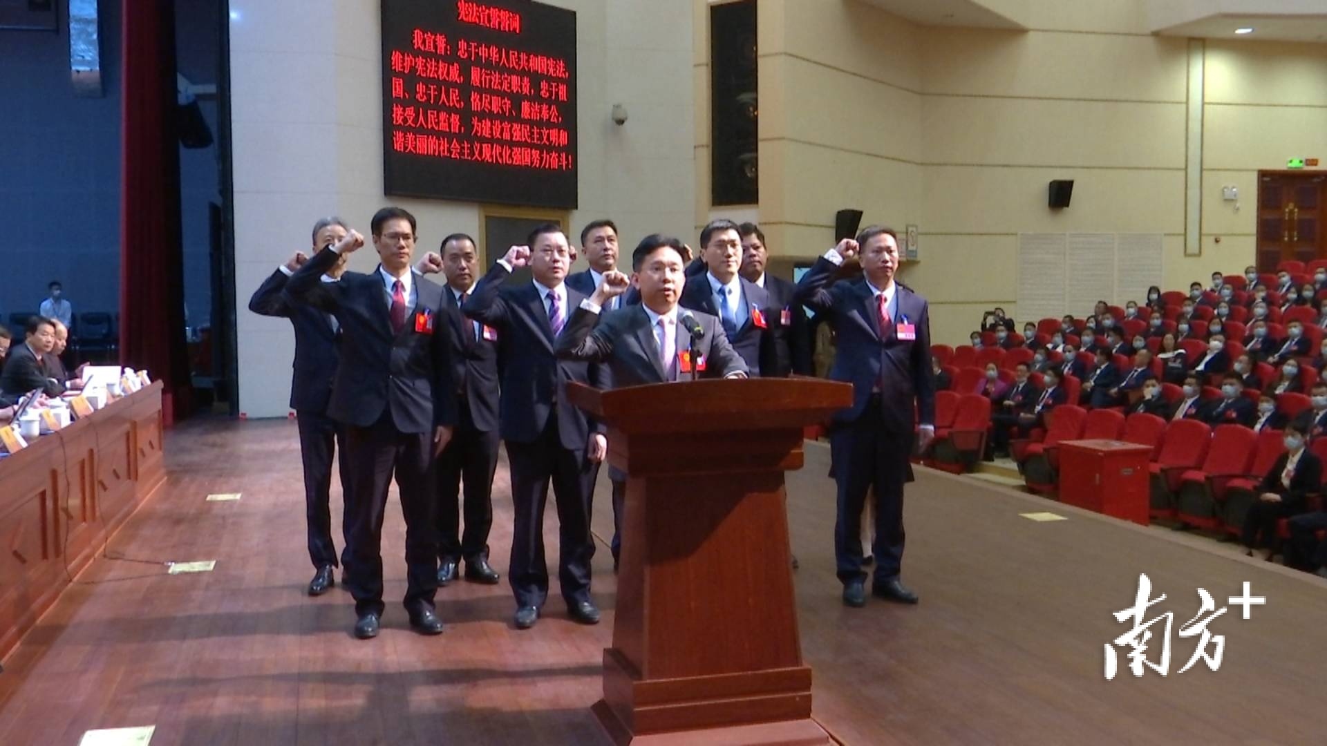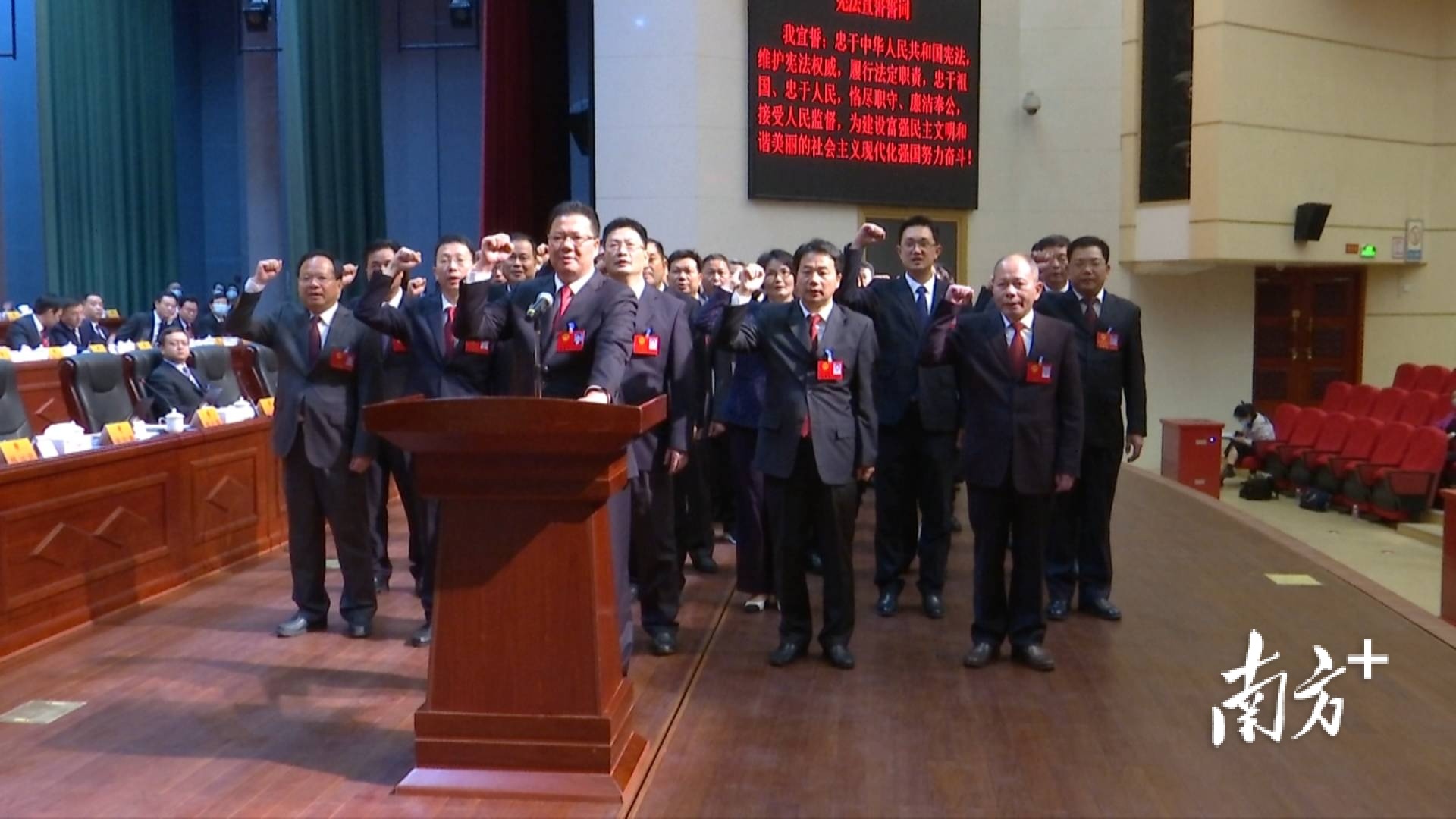 现场,大会为新当选人员颁发了当选证书,并举行了宪法宣誓仪式。田建容、陈广文分别作为新一届县人大常委会组成人员、新一届县政府领导班子等新当选人员的领誓人进行宣誓。领誓人手抚宪法,领诵誓词,其他宣誓人在后方列队站立,跟诵誓词。