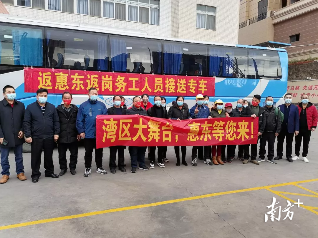 2月9日,惠东县首辆省外复工专车,从湖南省临澧县接回30多名技术工人前往平山青云工业园区2家企业返岗。