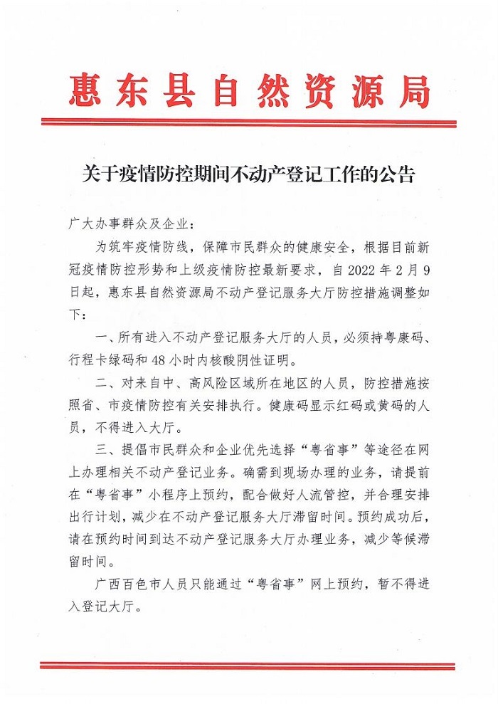 10日,惠东县自然资源局发布《关于疫情防控期间不动产登记工作的公告》。自2022年2月9日起,惠东县自然资源局不动产登记服务大厅防控措施调整,对所有进入不动产登记服务大厅的人员严格查验“两码”和48小时内核酸证明,保障市民群众的健康安全。