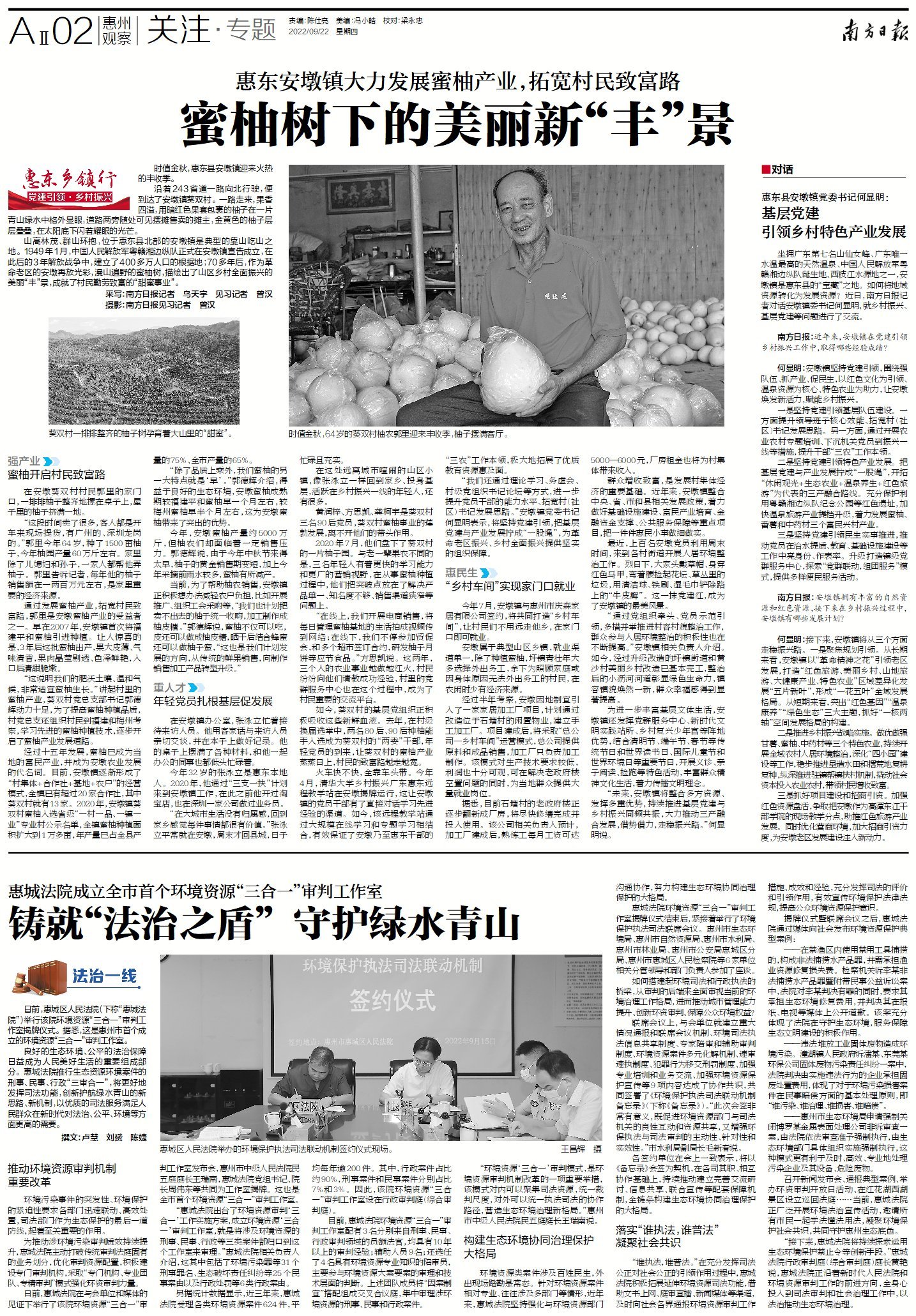 山高林茂、群山环抱,位于惠东县北部的安墩镇是典型的靠山吃山之地。1949年1月,中国人民解放军粤赣湘边纵队正式在安墩镇宣告成立,在此后的3年解放战争中,建立了400多万人口的根据地;70多年后,作为革命老区的安墩再放光彩,漫山遍野的蜜柚树,描绘出了山区乡村全面振兴的美丽“丰”景,成就了村民勤劳致富的“甜蜜事业”。