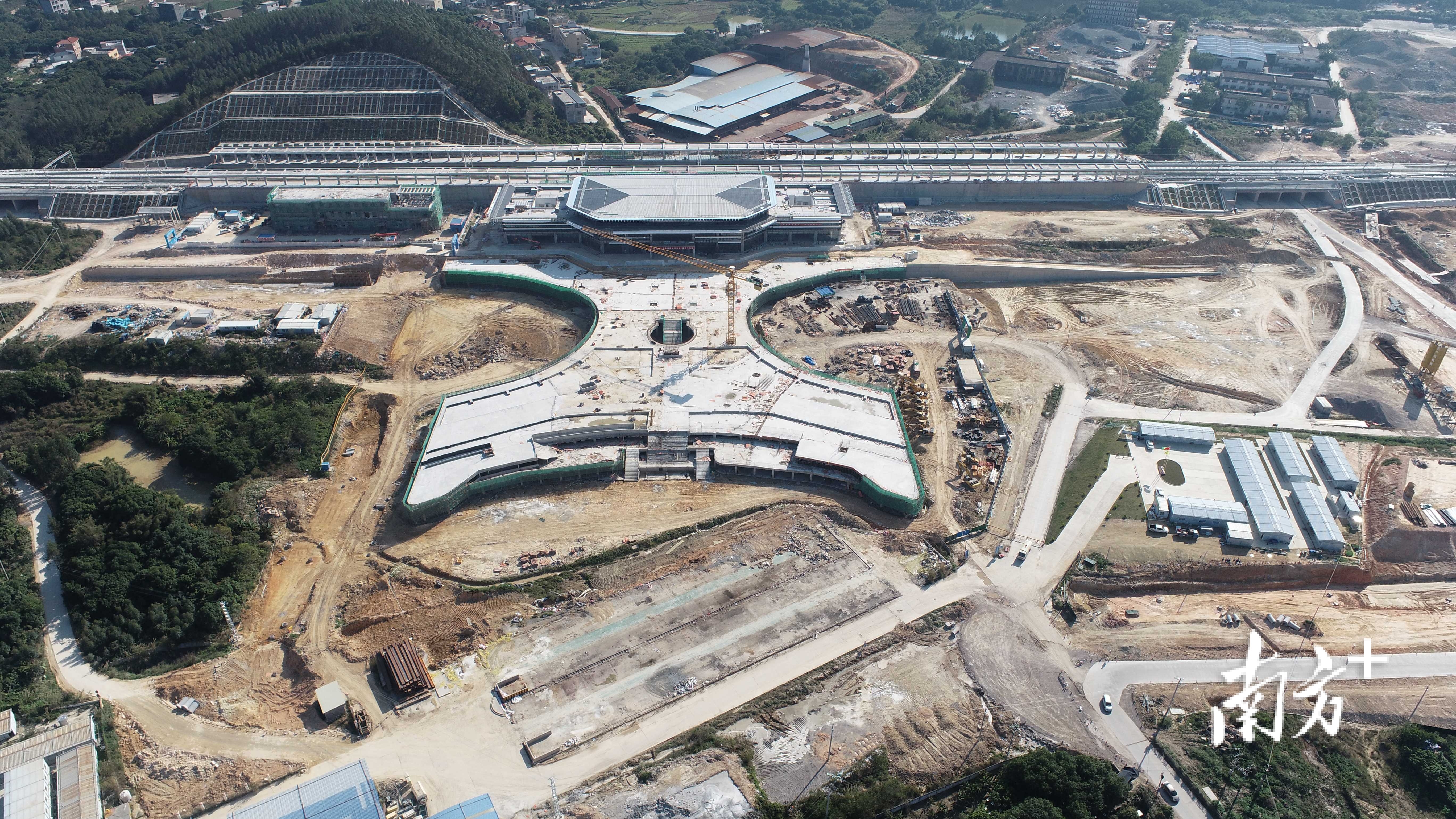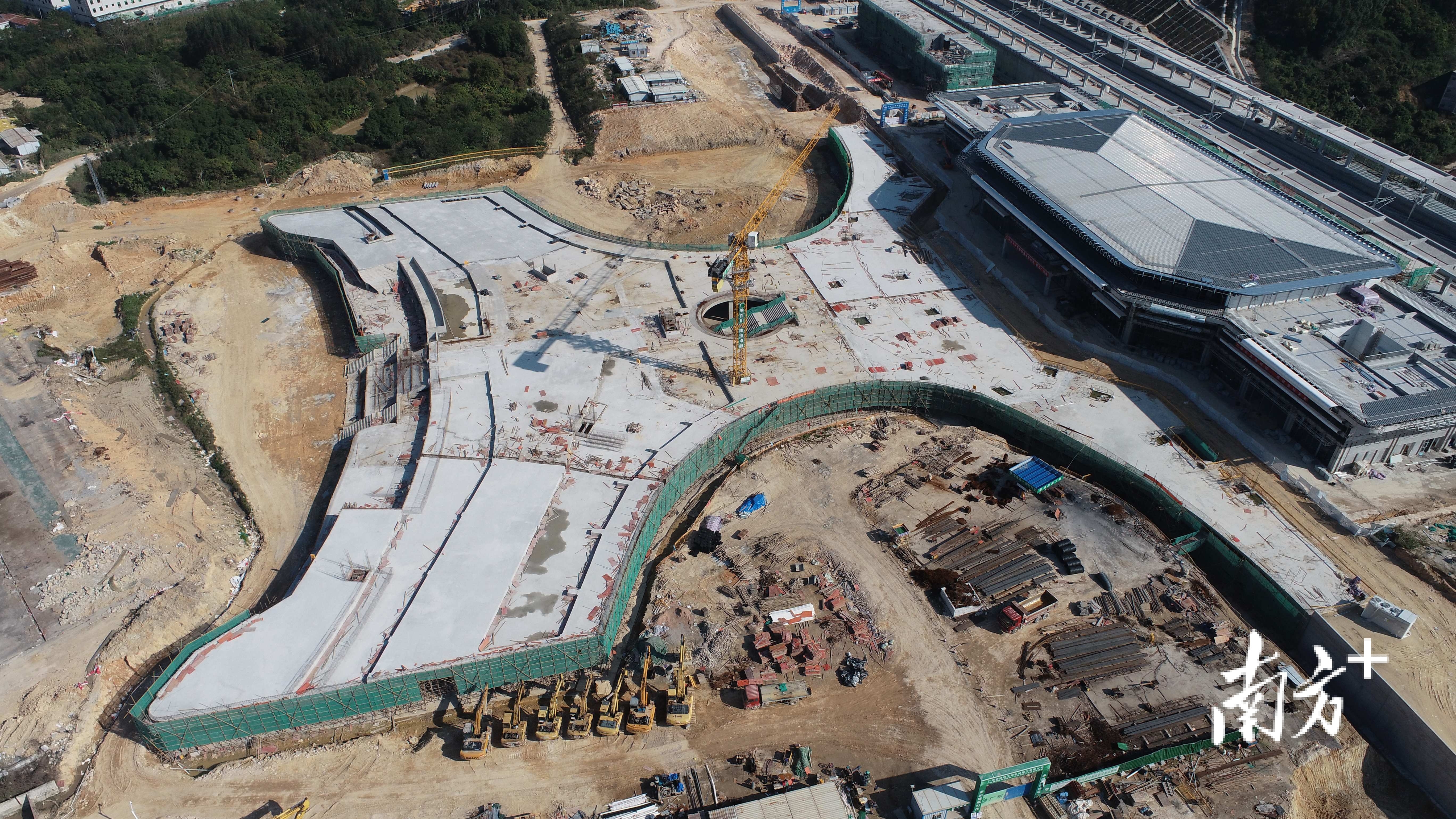 记者从工程现场可以看到,惠东站的建筑雏形已经显现,特别是其选材惠东滨海旅游胜地——双月湾而设计的“双湾拱月”广场造型,已然可以从航拍角度清晰拍到。