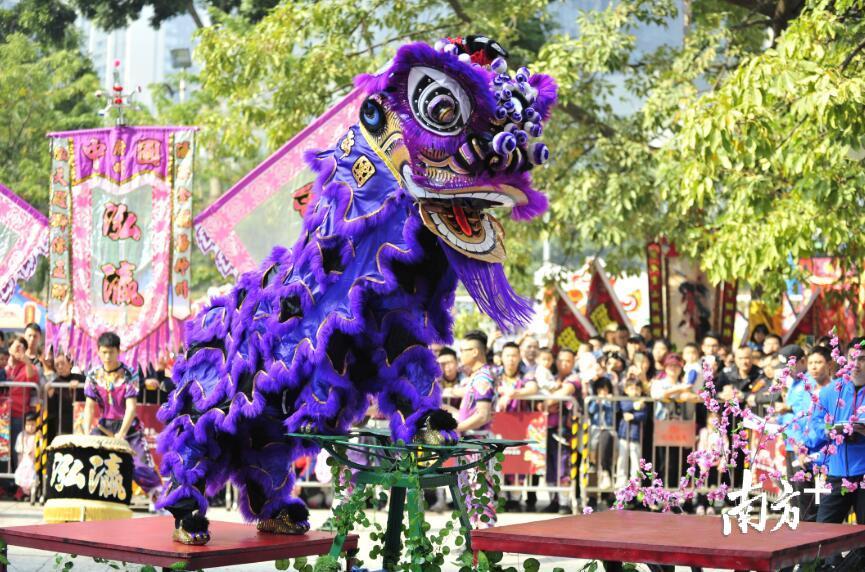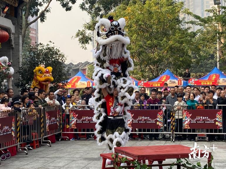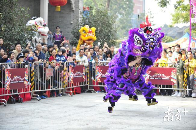 急点鼓声摆开了气势恢宏的架势,狮子将威武勇猛、醉态酣然等神态表现得淋漓尽致。跳桩、翻跟斗、采青、漂移……高难度动作依次呈现,惊险的表演将现场气氛推向高潮,赢得现场观众阵阵欢呼和掌声。
