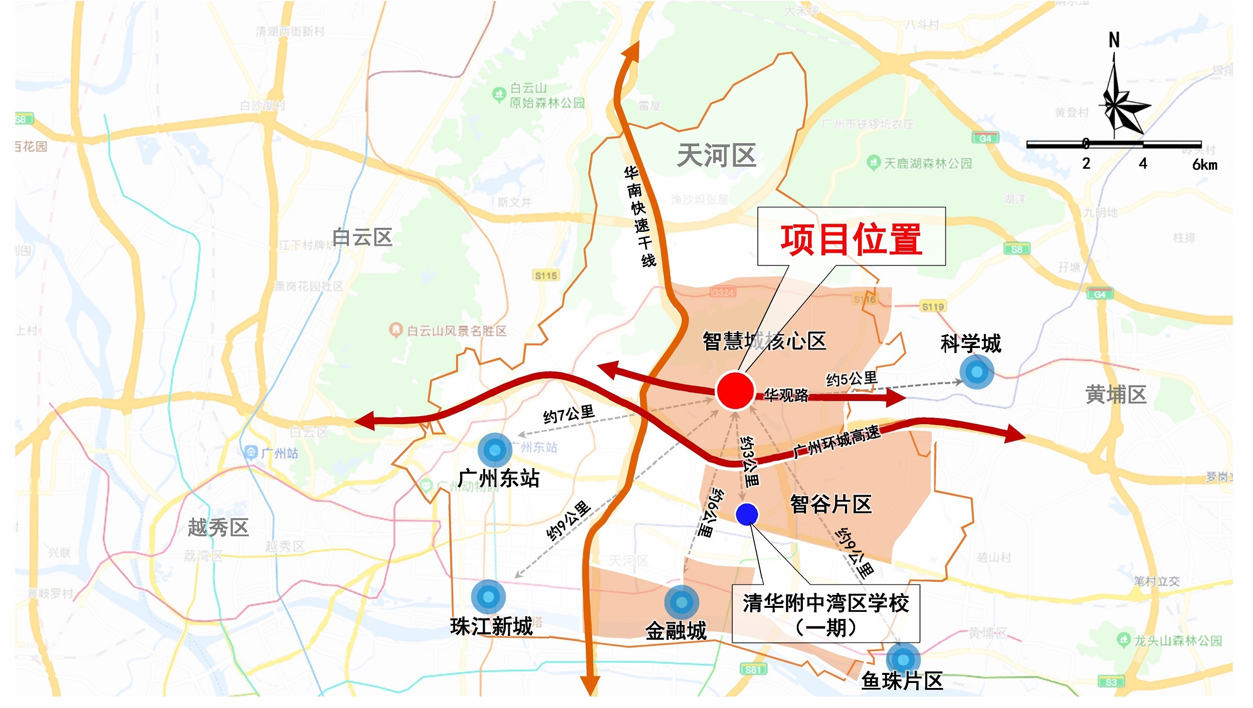 项目地块位于天河智慧城核心区,在华观路南北两侧,距离金融城约6公里、距珠江新城9公里。用地面积31.75公顷(约476.3亩),其中,华观路南侧为学校及居住地块,用地面积21.92公顷;北侧为项目村留用地地块,用地面积9.83公顷。