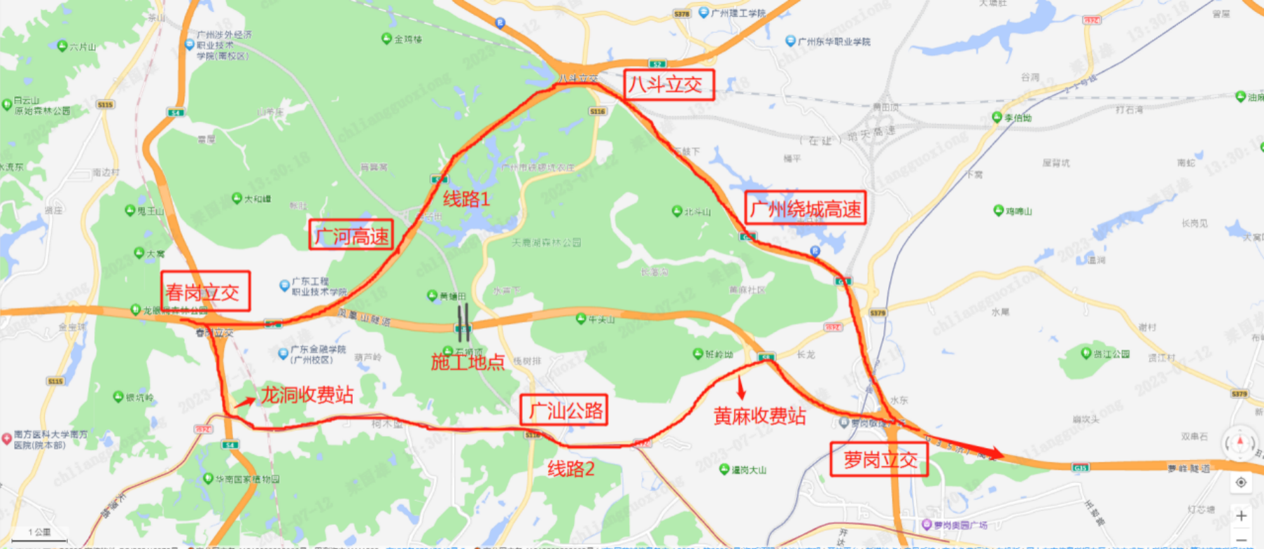 ①广河高速 → 广州绕城高速(八斗立交) → 济广高速(萝岗立交);