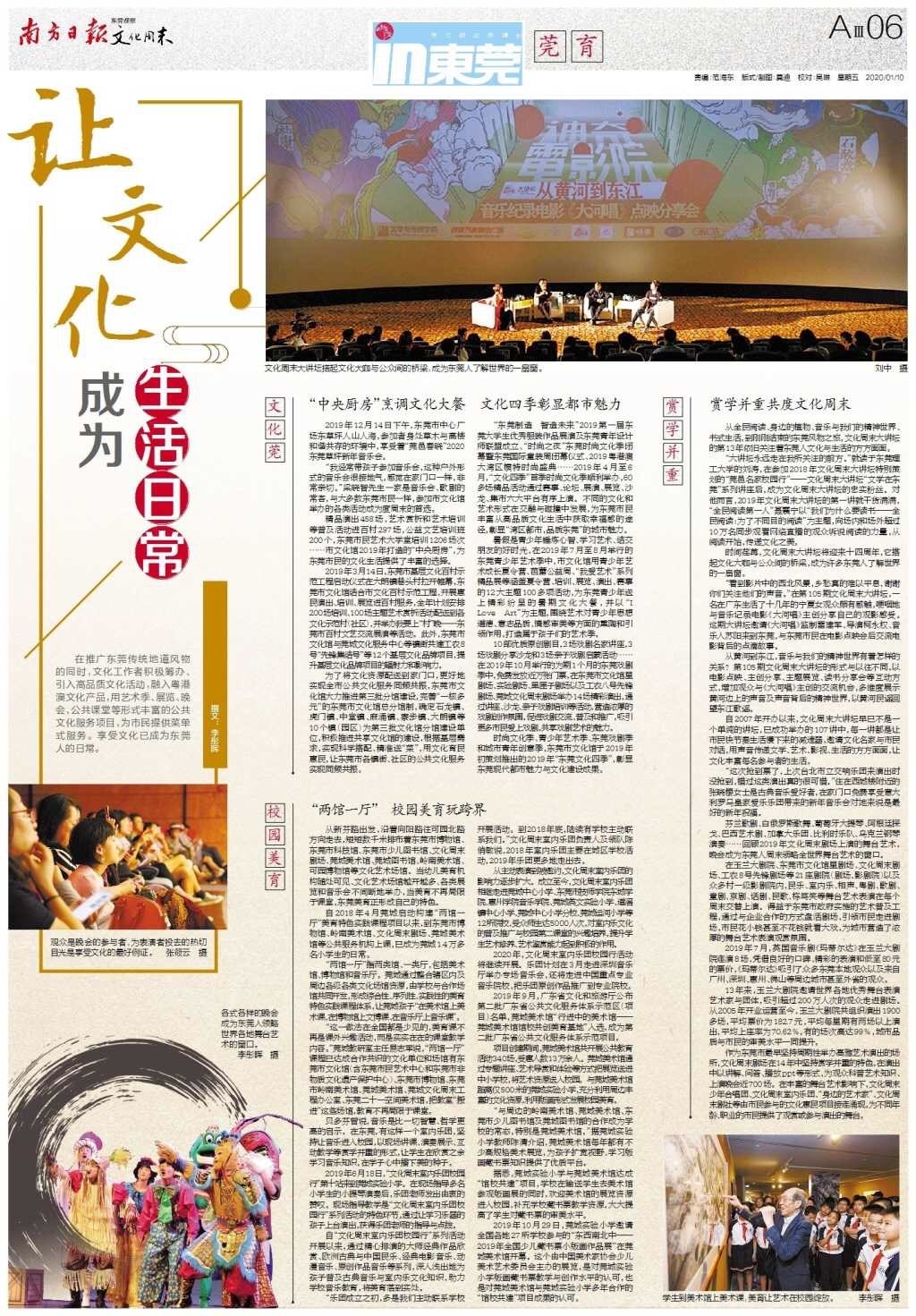 在推广东莞传统地道风物的同时,文化工作者积极筹办、引入高品质文化活动,融入粤港澳文化产品,用艺术季、展览、晚会、公共课堂等形式丰富的公共文化服务项目,为市民提供菜单式服务。享受文化已成为东莞人的日常。