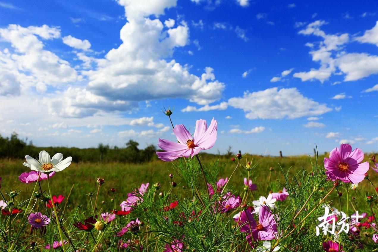 蓝蓝的天空,洁白的云朵,还有如同海洋般的花丛,记者在现场看到,这200亩花海主要以格桑花、孔雀王、三角堇等花为主。放眼望去,红色、粉色、白色成片的格桑花迎着春风摇摆,花海间还点缀了稻草人、风车、水车等各式小景,若用无人机从高空俯览,好像一张花瓣被子铺在乡野绿林之中。