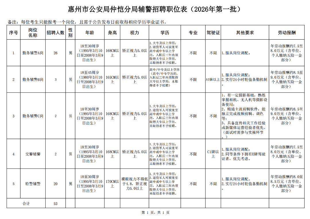 公开招聘警务辅助人员53人