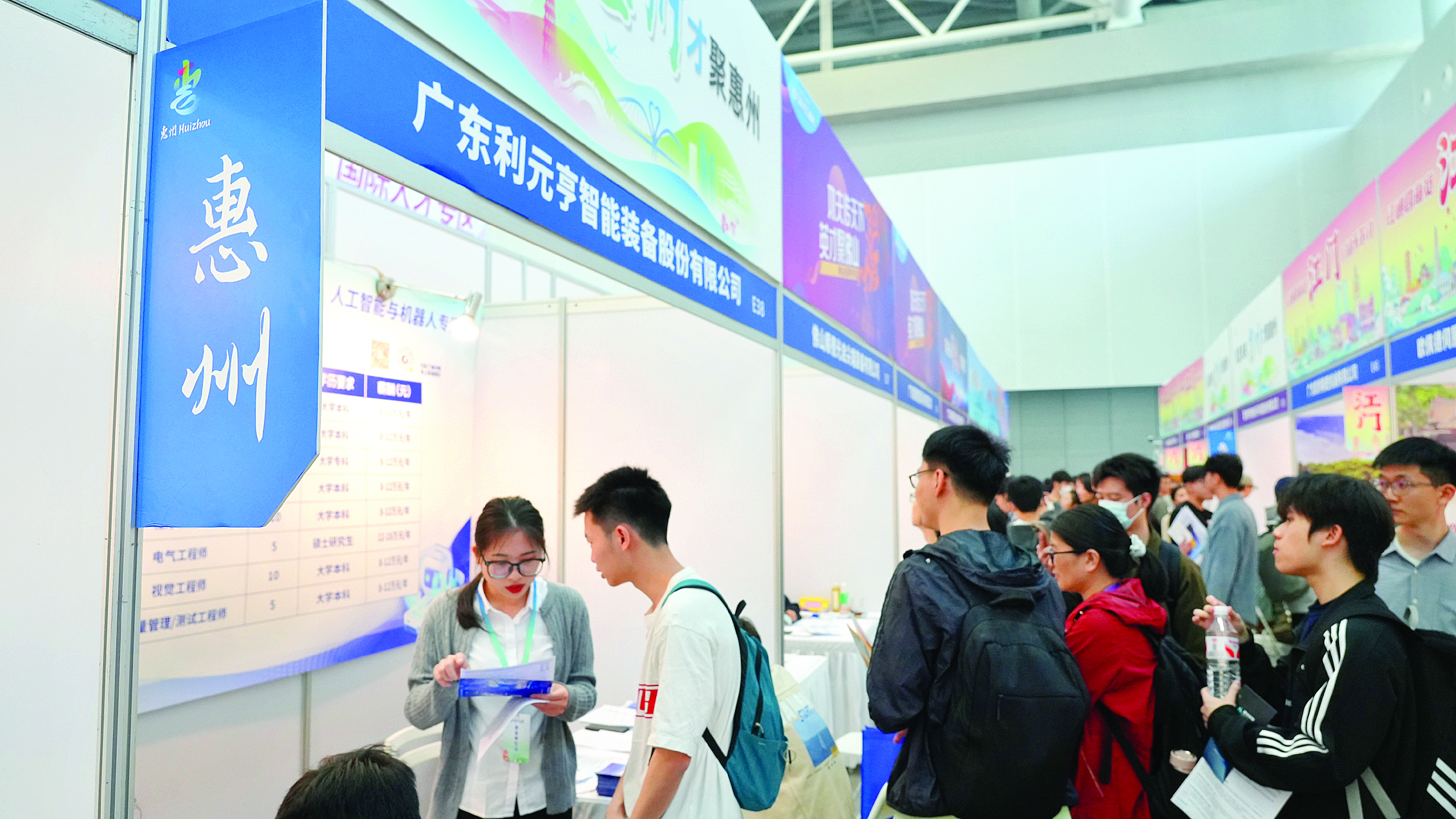 招聘现场,在惠州企业展位前穿梭的各类求职者身影,生动勾勒出人才聚“惠”的鲜活图景。