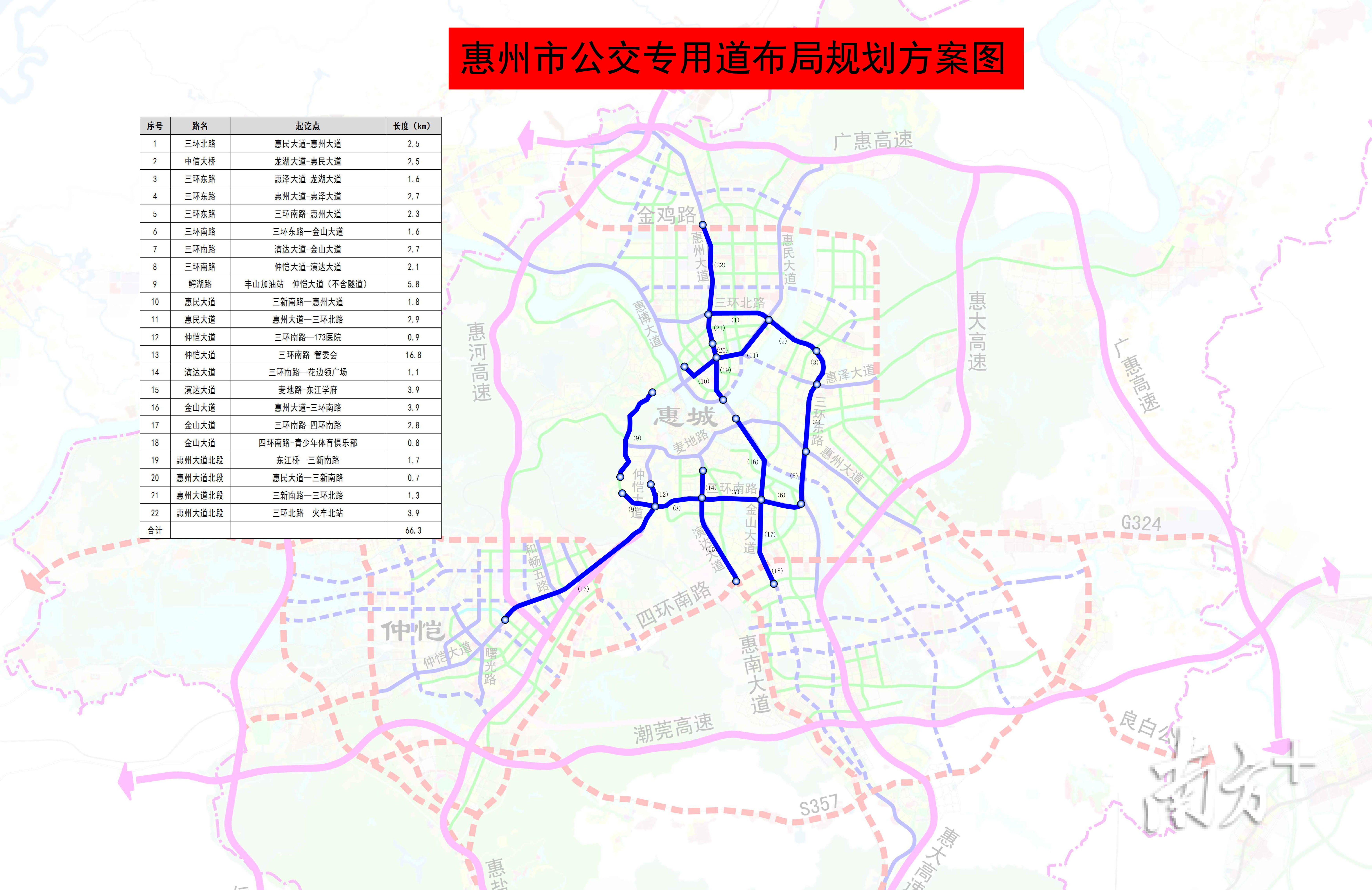 根据规划方案,共有9条路段将建设公交专用道,主要是三环线的环状路,及其周边呈放射性的一些路段。涉及三环北路、三环东路、三环南路、鳄湖路、惠民大道、仲恺大道、演达大道、金山大道、惠州大道北段,总长度达到66.3公里,工程估算总投资为3452.33万元。