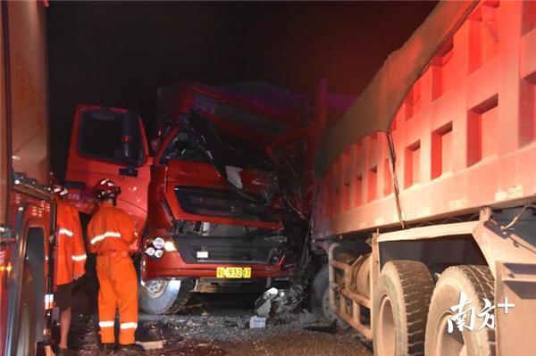 7月23日凌晨3时15分,大亚湾中队接到110转接过来的一单抢险救援警情,位于丰田水库惠澳大道路段发生交通事故,有两名驾驶员被困驾驶室内。大亚湾消防中队闻警后立即出动1车7人赶赴现场。