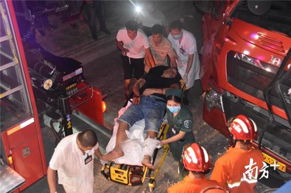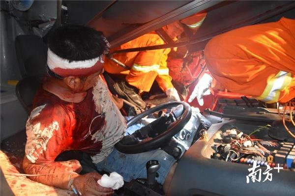 消防官兵到场后发现,发生碰撞的两辆渣土车由于速度过快,导致车头严重变形。两名被困的驾驶员当时意识清醒,只是由于碰撞猛烈,下半身被卡于方向盘内不得动弹。了解情况后,大亚湾消防中队与同时到场的惠阳消防一中队官兵立即对两名被困驾驶员实施救援。消防官兵利用一系列破拆器材,如液压剪切钳及液压扩张器等进行破拆与扩张。救援期间,由于车厢空间的狭小,并且一名被困驾驶员的头部在撞击时受伤,导致流血不止,都给现场救援增加了难度。为避免在救援时发生二次伤害,大亚湾消防中队官兵步步为营,小心翼翼的从车厢边缘部位慢慢向内破拆。