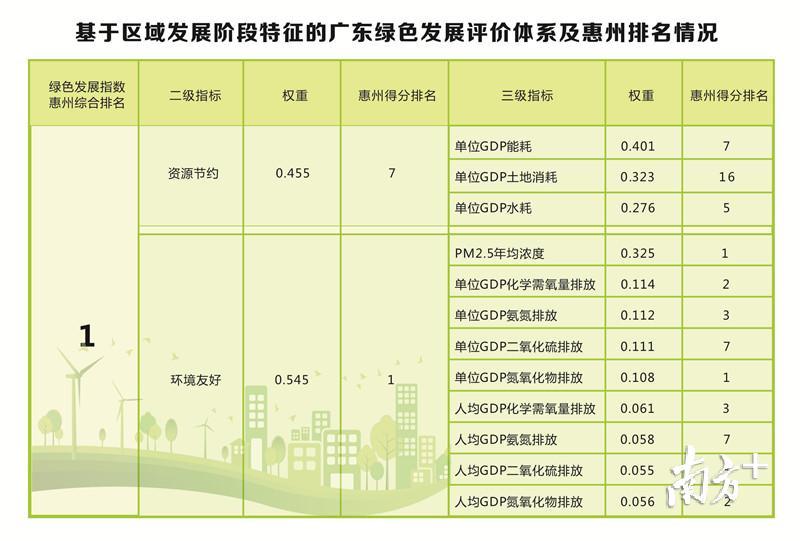 今年6月,广东省社科院联合南方报业传媒集团发布的研究报告显示,惠州的绿色发展指数评价综合得分在全省21个地市中排第一,连续两年居首,呈现出高水平的绿色发展。但从二级指标——资源节约的得分来看,惠州排在第7位。其中,三级指标——单位GDP能耗得分排在全省第7位,单位GDP水耗得分排在全省第5位,单位GDP土耗得分排在全省第16位。