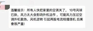 有朋友圈转“温馨提示”:所有人快把家里的空调关了,10号风球已掛,风力太大会影响外机运作,可能风力压过空调外机散热,风机逆转引起两股电流相撞烧机,后果會很严重!