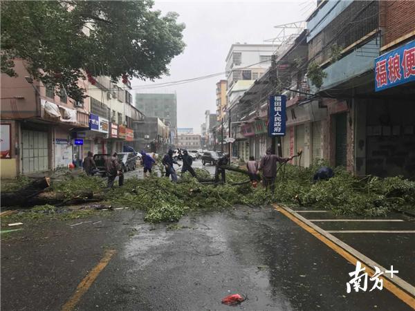 16日早上8时到13时,博罗县福田镇录得全县最大阵风,达35.4米每秒,风力达12级。部分圩镇和村的树木、电线杆、广告牌、路牌等纷纷被狂风吹倒。为了保障群众的生命财产安全,及时发现险情,第一时间处置好。