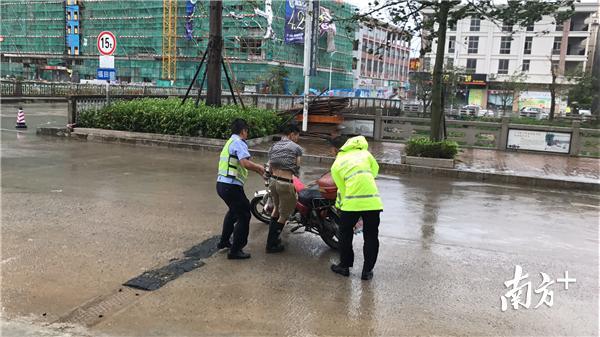 “圩镇主干道福政路的大树被台风吹倒了。”16日下午3时,博罗县福田镇24小时在线的城监应急队人员接到情况,立即拿着电锯,披着雨衣迎着狂风转移战场,一边指挥现场车辆绕道,一边采取应急措施锯树清障。