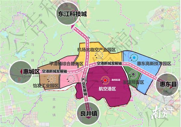 在空间上,产业园将形成“一心、双轴、六区”的结构。即以惠州机场为中心,分别以空港新城发展轴和产业发展轴为东西轴和南北轴,建设航空港区、机场北临空产业园区、惠东高新技术园区、怡发工业园区、平潭镇综合服务区和发展预留区。