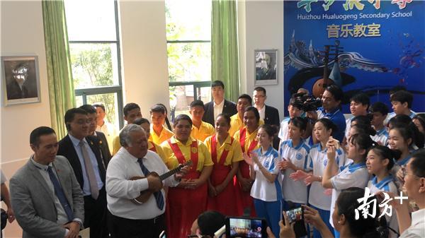 图伊拉埃帕总理在现场仔细聆听和观看,融合的氛围感动了图伊拉埃帕,他不仅即兴发表演讲,看到音乐教室有一把尤克里里,拿起来便弹奏了一曲萨摩亚民谣,与现场的萨摩亚师生唱了起来。