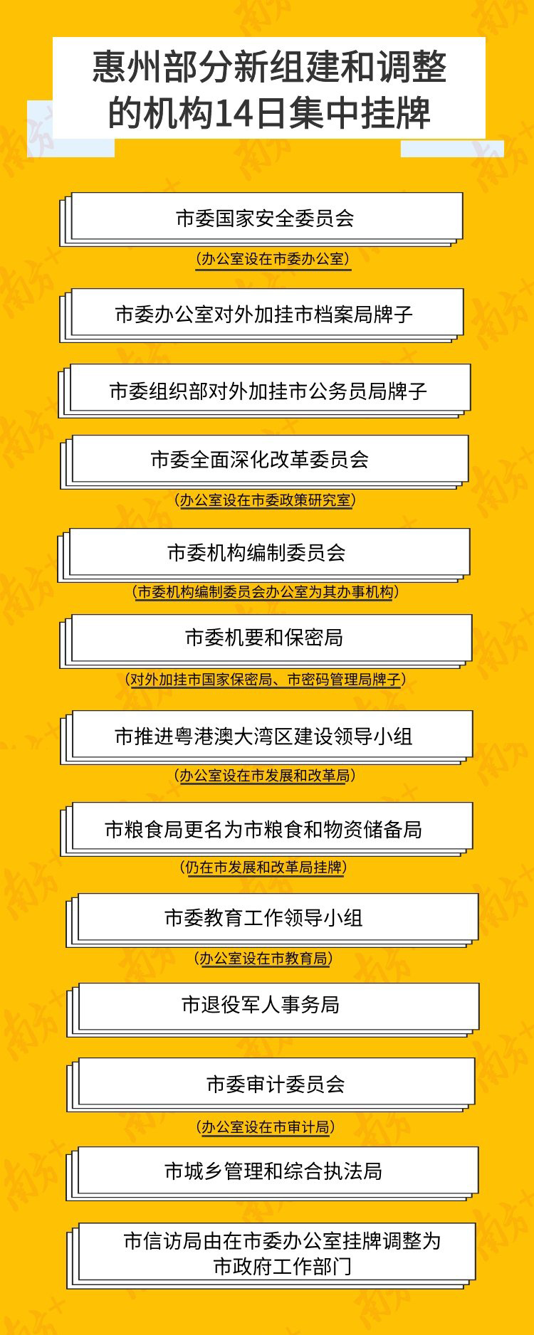 根据省委批准的《惠州市机构改革方案》,惠州牢固树立“四个意识”,坚定“四个自信”,把推进机构改革作为“两个坚决维护”的政治要求和具体行动,切实抓好方案的组织实施,以坚定的信心和决心狠抓落实,改出发展的新局面、新气象。14日,惠州部分新组建和调整的机构进行了第一批次集中挂牌。陆军第74集团军副政委李振领少将,惠州市委常委、常务副市长胡建斌,市委常委、组织部长沈亦军,市委常委、秘书长、市政府党组成员刘小军,副市长林洪、陈高燕,惠州军分区政委段琦大校等出席相关活动。