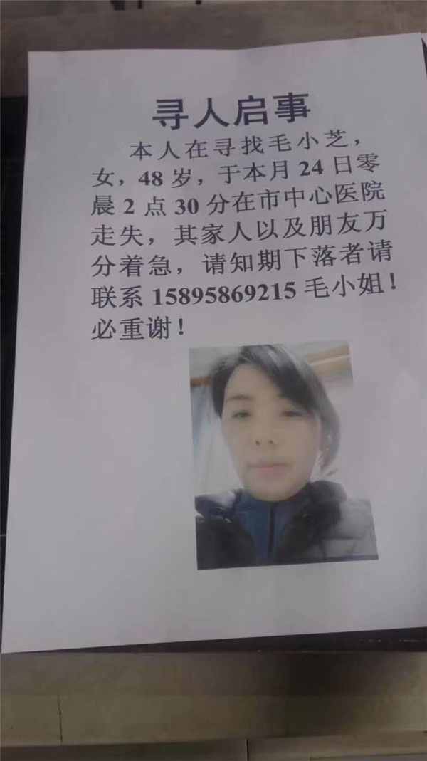 南方+记者核实:2月24日凌晨,毛小芝在惠州市中心医院走失,走失时身穿蓝色羽绒服,短裤,拖鞋。