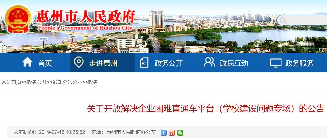 7月16日,惠州市人民政府办公室发布《关于开放解决企业困难直通车平台(学校建设问题专场)的公告》。惠州市委、市政府有关领导拟定于2019年8月2日在市行政服务中心约见在建设方面存在疑难问题的学校,面对面研究解决诉求的各相关问题。