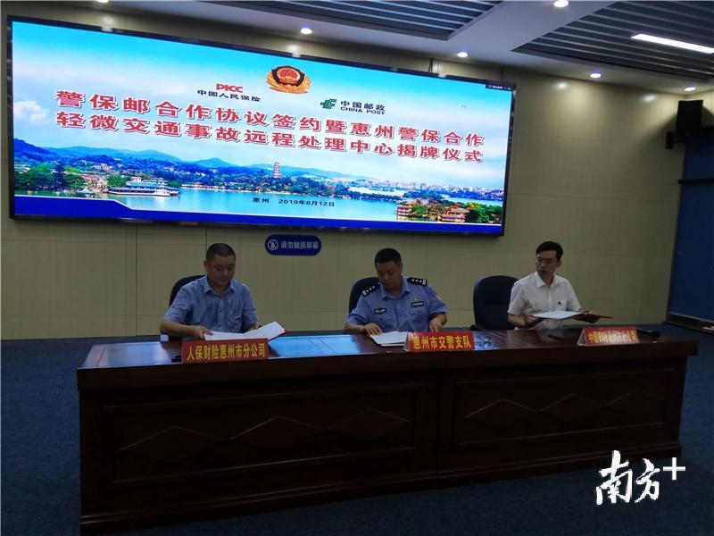 为落实公安交通管理“放管服”便民工作举措,大力推进“互联网+交管”服务工作,12日,惠州市公安局交警支队联合中国人保财险惠州分公司、邮政部门三方签约,合作建设“警保邮便民服务厅”。签约仪式过后,惠州警保合作轻微交通事故远程处理中心正式揭牌运行。