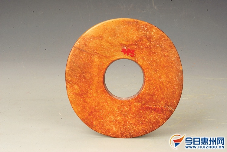 惠州博物馆藏一件玉璧,呈圆形扁平状,直径20.1厘米,厚0.45厘米,正中开圆形孔,孔径4厘米。素朴无纹饰,打磨略显粗糙,色呈棕黄,可见自然沁色,璧面和边缘稍有损缺,内外缘厚度相当,器物简洁,古朴厚实。该玉璧经广东省文物专家鉴定为商代玉璧,并定为国家二级文物。