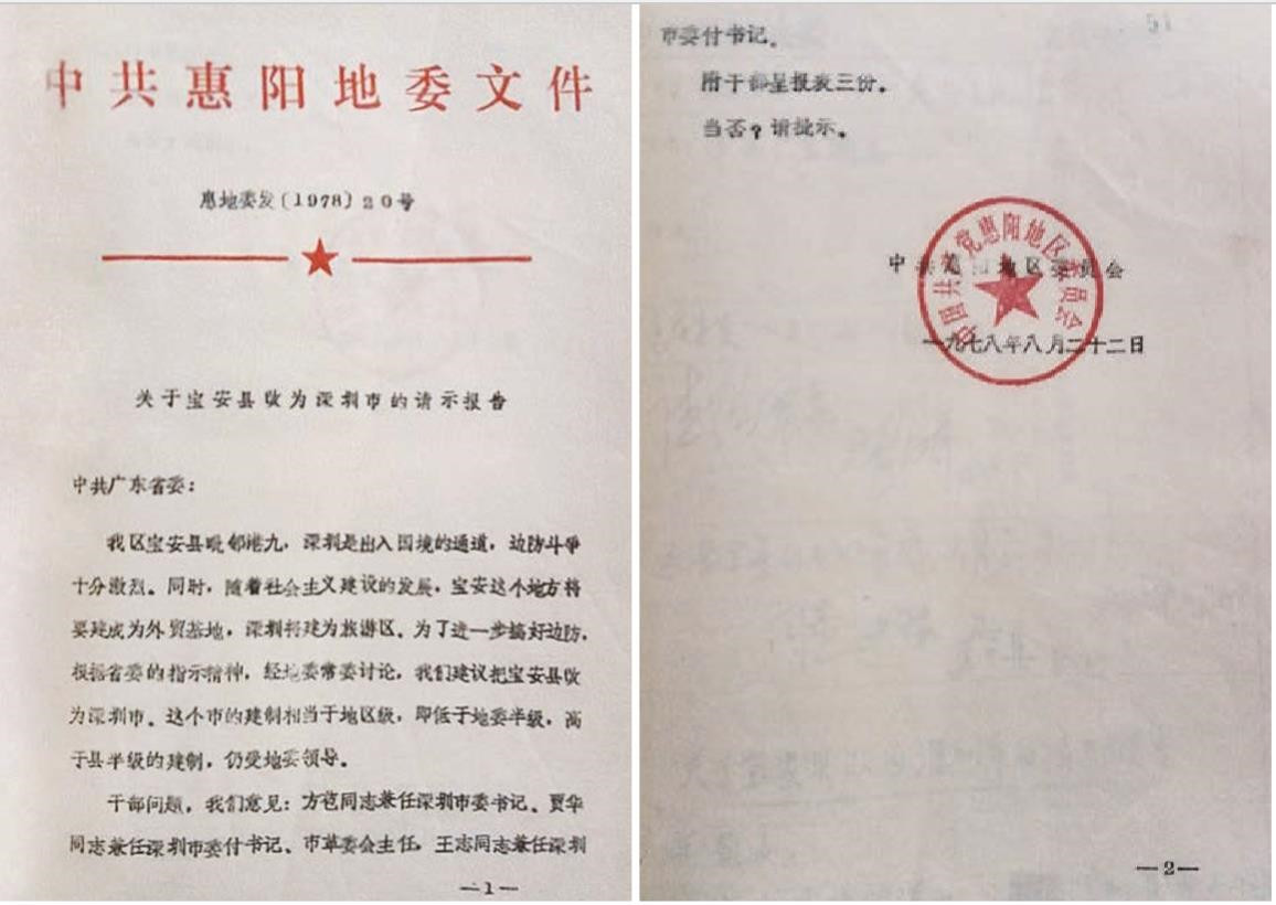 这其实有一个上下互动的过程。当时,国家部委和广东省的有关领导多次去宝安县调研,认为那里有区位等优势,中央领导也定调可以进行先行探索。而宝安县和惠阳地区对于自身的发展有很强烈的愿望,惠阳地区也很支持宝安县,包括当时在报送给省委的请示报告中提出宝安县改为深圳市。下面有呼声、上面有决策,在这样的互动下促成了此事。