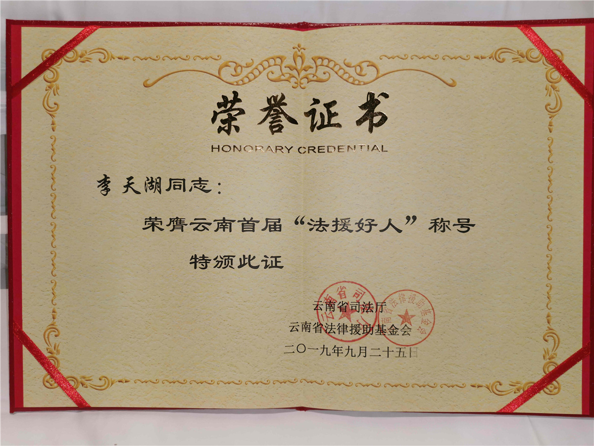 在庆祝新中国成立70周年之际,云南省首届“法援好人”评选活动颁奖典礼在春城昆明举行,惠州律师李天湖在评选活动中脱颖而出,获评云南首届“法援好人”。