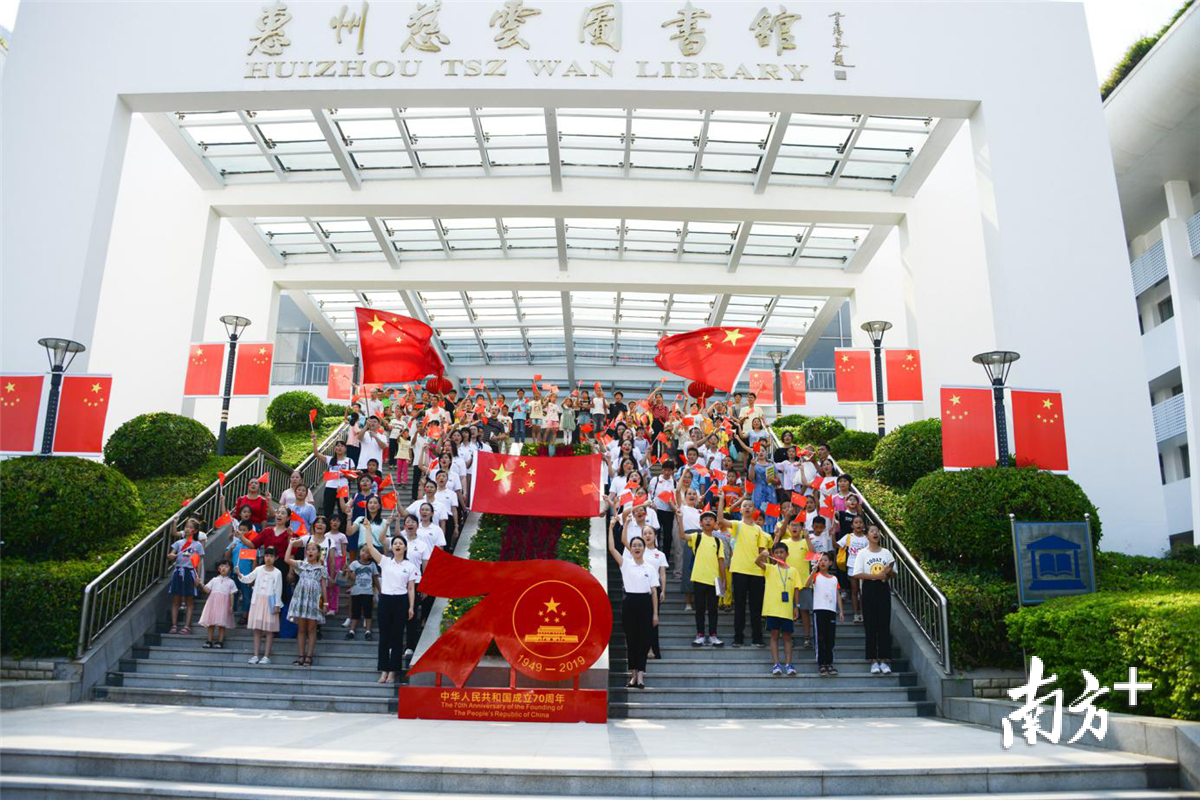 惠州慈云图书馆员工和读者在图书馆正门快闪《歌唱祖国》。
