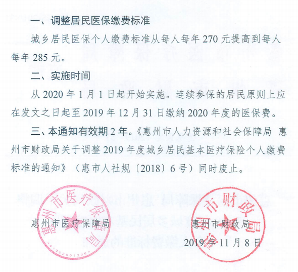 此前,惠州市医疗保障局曾发布《关于公开征求调整2020年我市城乡居民基本医疗保险个人缴费标准社会意见的公告》,提出“拟将2020年居民医保个人缴费标准从每人每年270元调整到每人每年300元”。经过公开征集意见和充分讨论,最终的缴费标准调整为285元。