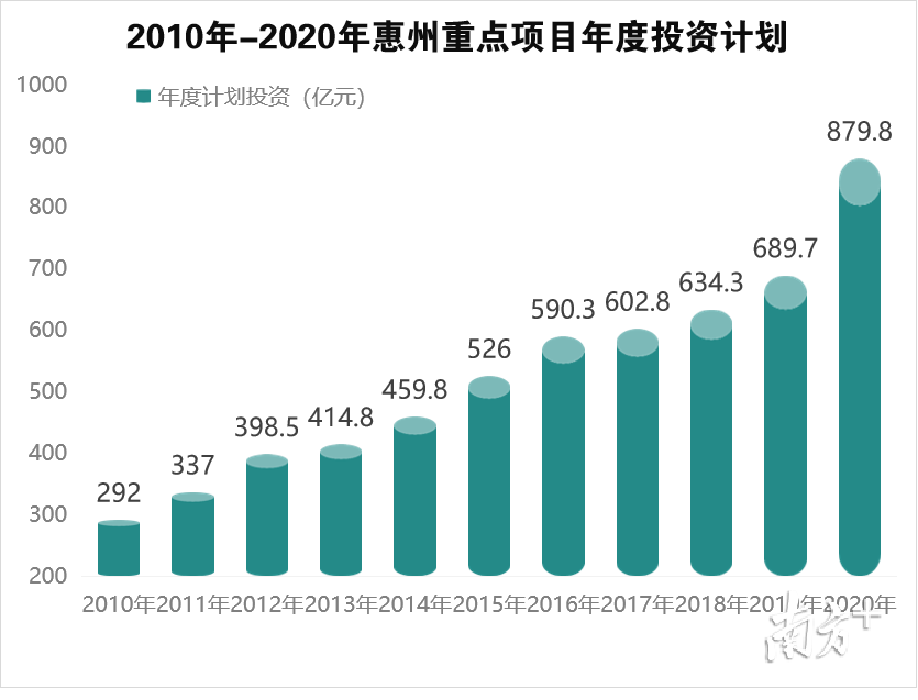 来自惠州市发改局的数据显示,今年惠州计划安排252项重点建设项目、年度投资计划879.8亿元。其中,基础设施工程86项,年度计划投资446.2亿元;产业工程146项,年度计划投资413.5亿元;民生工程20项,年度计划投资20.1亿元。