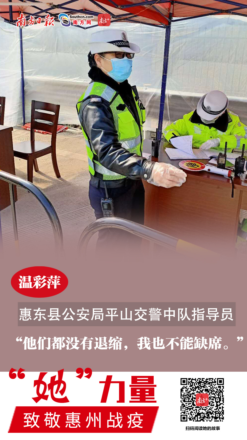 新冠肺炎疫情发生后,惠东县公安部门在全县32个重要一线卡口成立9个战时临时党支部。温彩萍从警28年,去年她因腰部骨折才完成拆除钢板手术,但仍克服自身不适,战斗在防疫一线。在高速出口谭公卡哨,她做到“逢车必查,逢人必核”,并积极做好检查对象的安抚和服务工作。温彩萍说:“中队里有好多名老同志,家里也很多这样那样的难处,他们都没有退缩,我也不能缺席。”