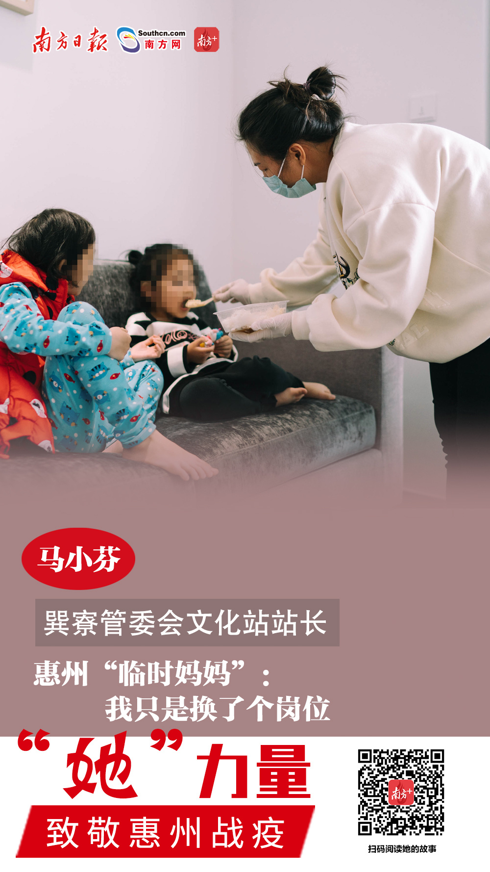 马小芬是惠东巽寮的一名基层干部,也是一位单亲妈妈。她的丈夫是一名退伍军人,后来转业到地方工作,在2013年因公殉职。2月初,从武汉到巽寮湾度假的游客乌晴(化名)一家六口,有四人确诊新冠肺炎,留下两个幼童无人照顾。马小芬把自己的孩子安置到爷爷奶奶家,挑起了“临时妈妈”的重任,照顾患者孩子30天,直到他们一家团圆。她的初心很朴素:“疫情来了,这种时候,我们这种基层工作人员肯定要在一线,我只是换了个岗位。”>>>点击看她故事