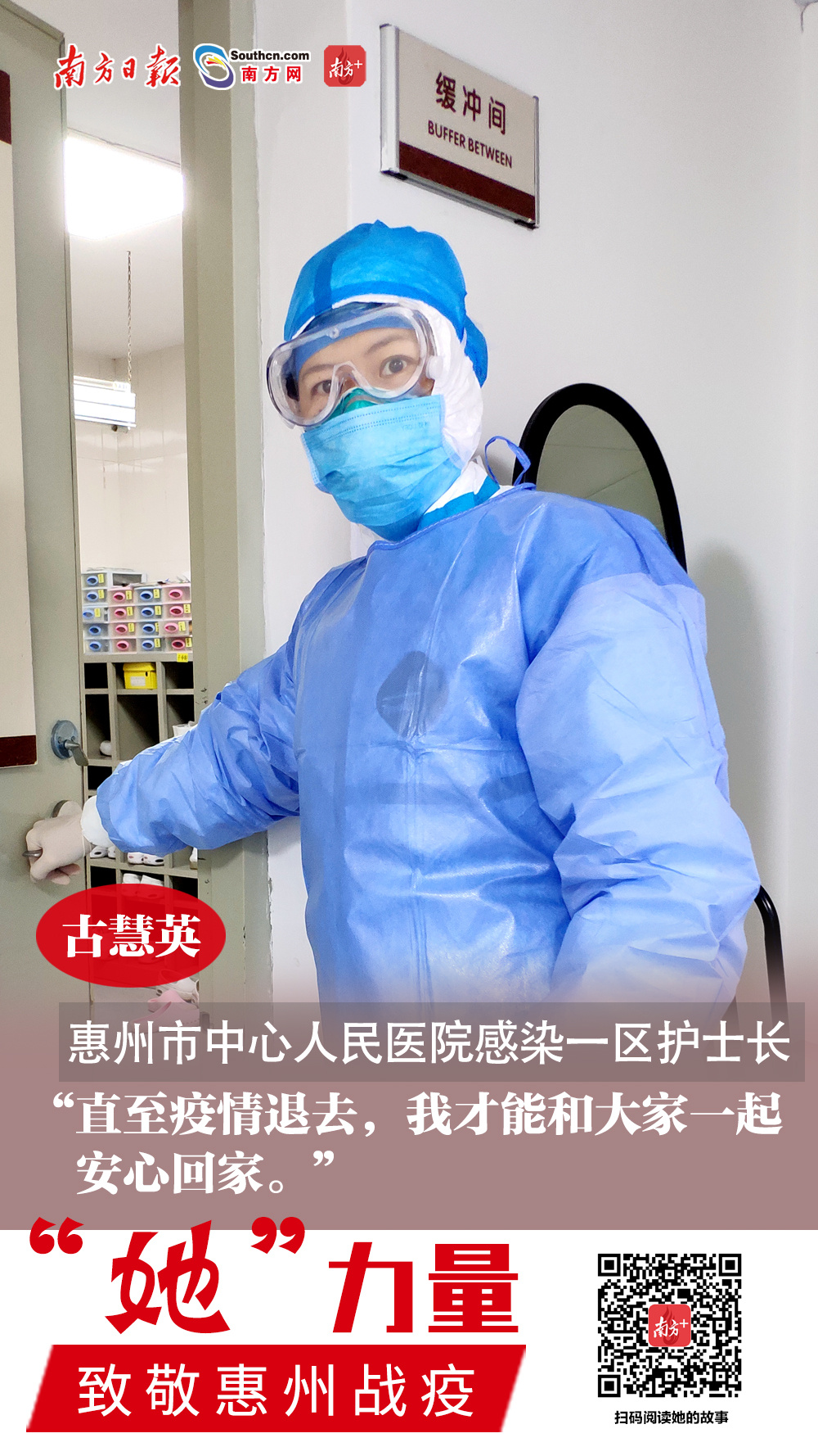 自1月19号惠州市中心人民医院收治首例新冠肺炎疑似病例开始,感染一区护士长古慧英就连续奋战在抗疫一线。她的儿子正在读高三年级,即将参加高考。在抗疫一线奋战的这些天里,她从未回过家,只能通过视频和儿子以及73岁的老母亲短暂交流。在战疫一线,她不仅对待患者耐心细致,也是科室里的“管家”,关心照顾着同事们的起居饮食和情绪。>>>点击看她故事